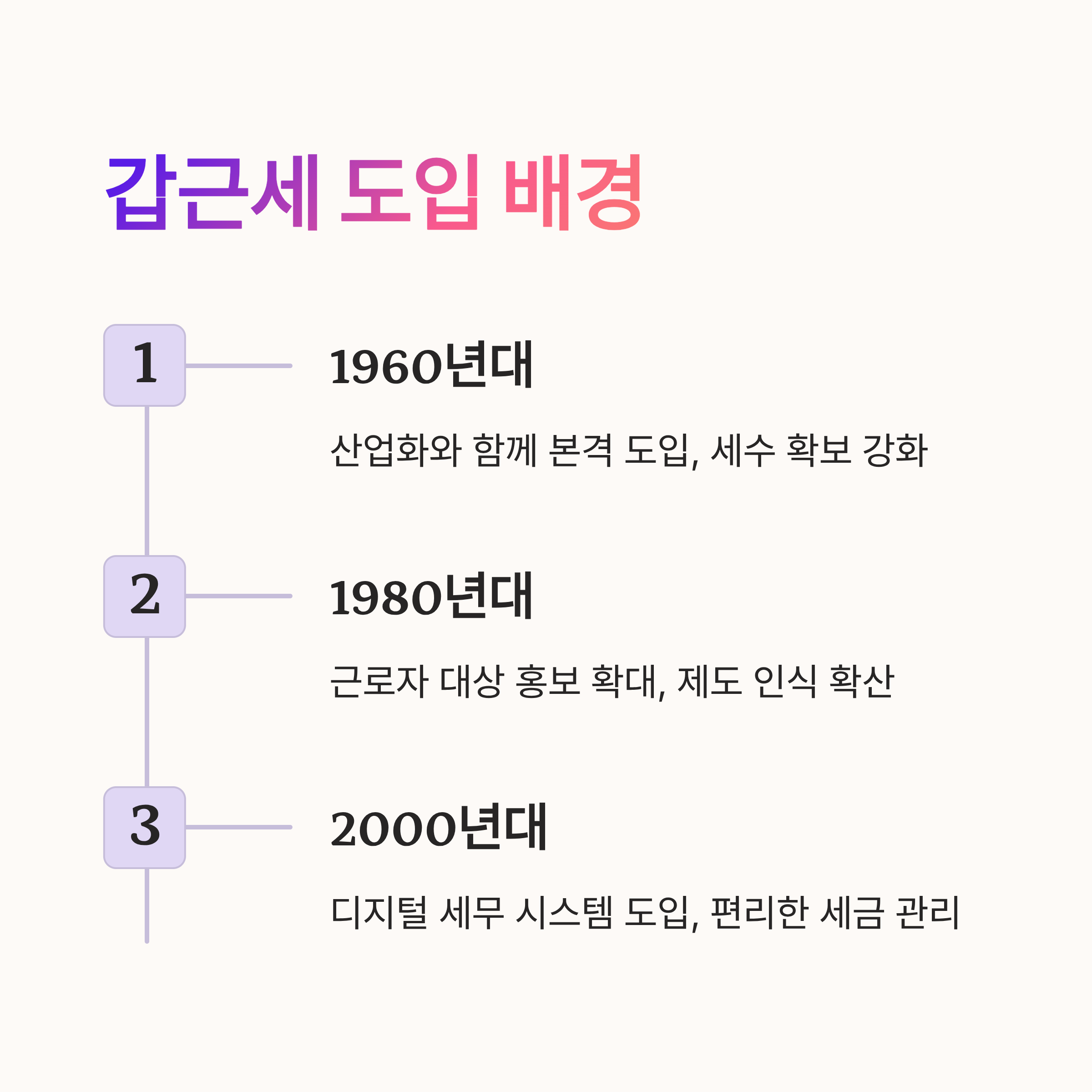 | 1960년대 | 산업화와 함께 본격 도입 | 세수 확보 강화 |