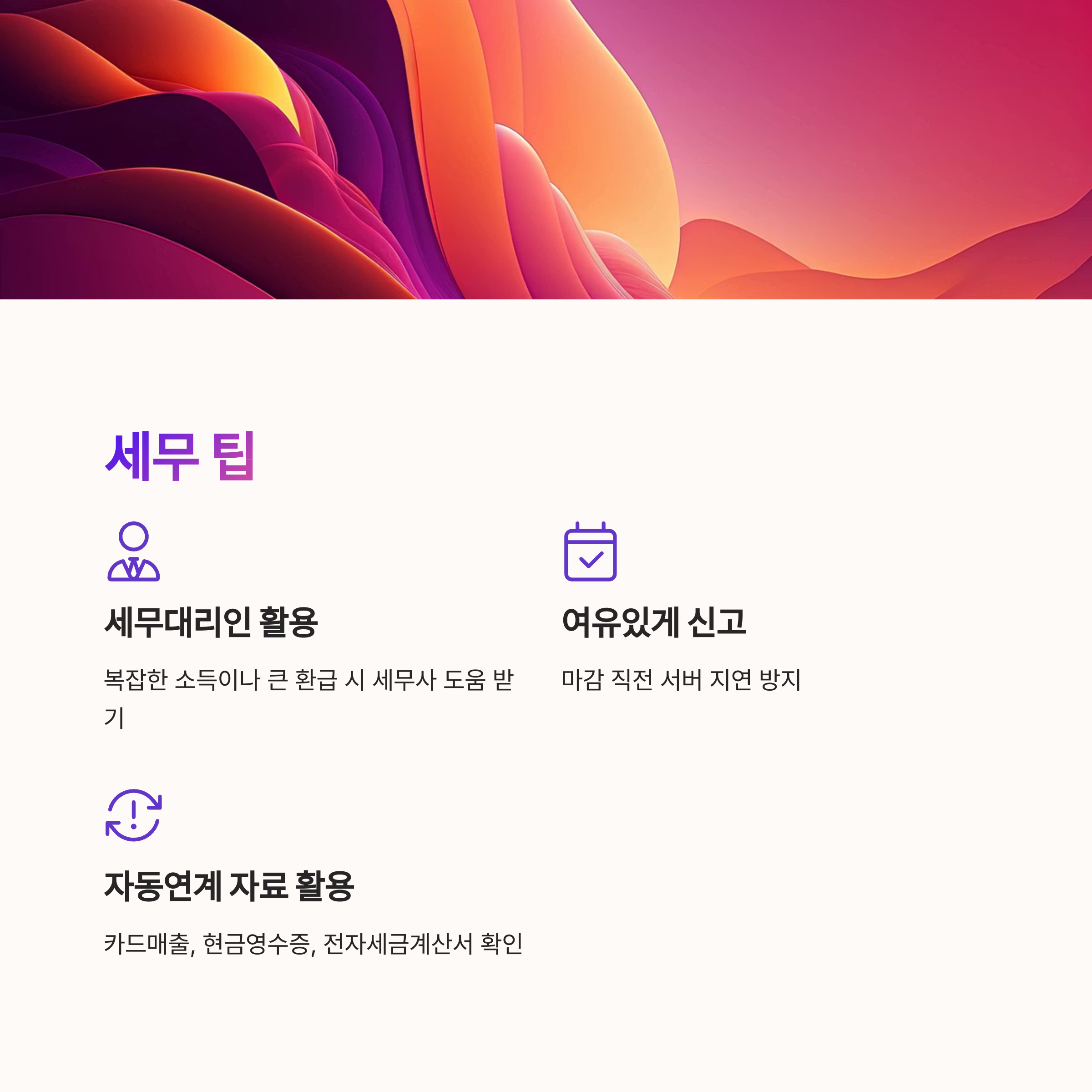 마지막 팁은 자동연계 자료를 잘 활용하라는 거예요. 홈택스에는 신용카드 매출, 현금영수증, 전자세금계산서가 자동으로 연계되는데요, 이를 토대로 자료 누락 없이 정확한 신고가 가능해져요.