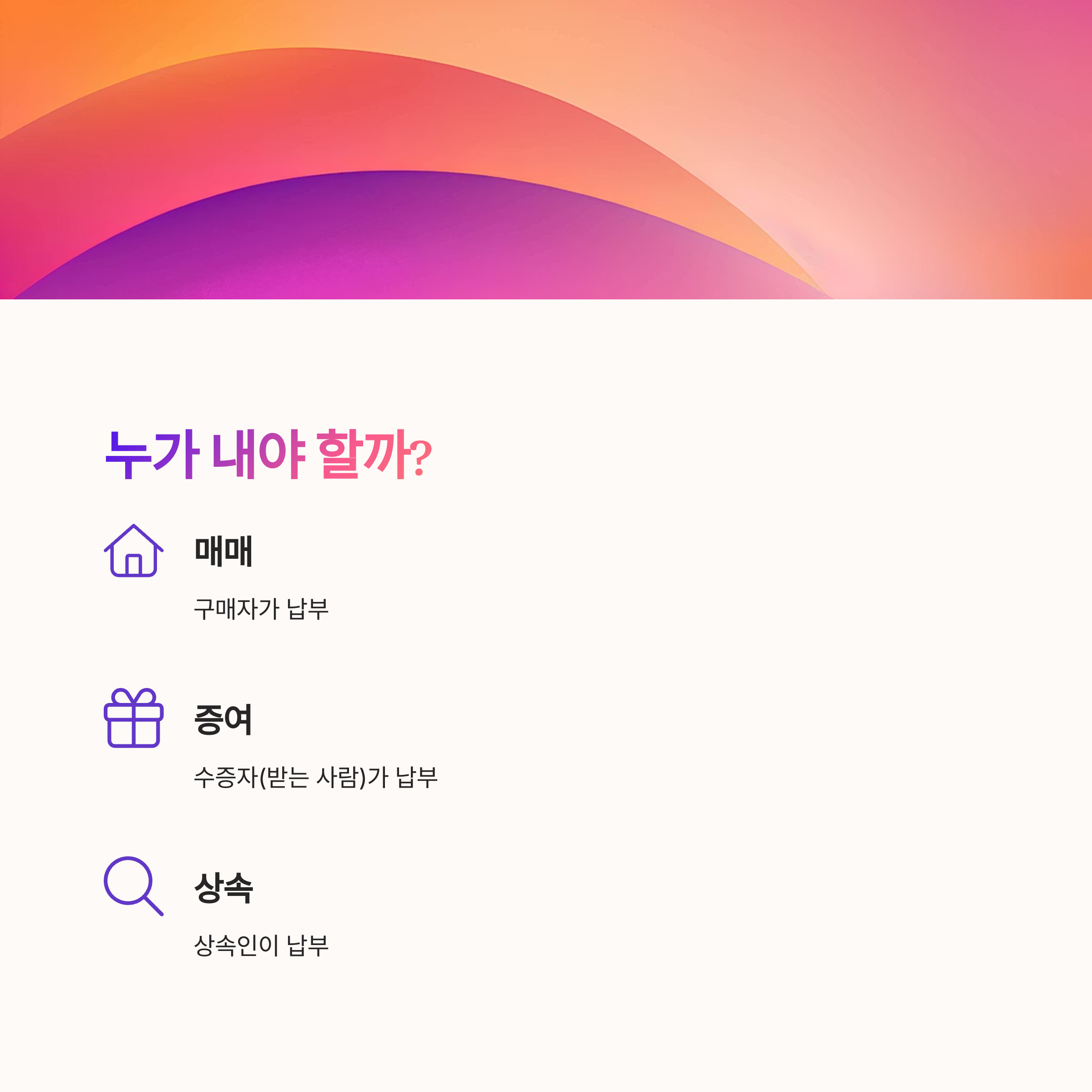 취득세의 경우엔 말 그대로 부동산을 '취득하는 사람'이 납세의무자가 돼요. 예를 들어, 부동산을 매매해서 샀다면 구매자가, 상속받았다면 상속인이 세금을 내야 하는 거죠. 단, 공동으로 소유하게 되는 경우라면 각각의 지분에 따라 세금도 나눠 내게 돼요.