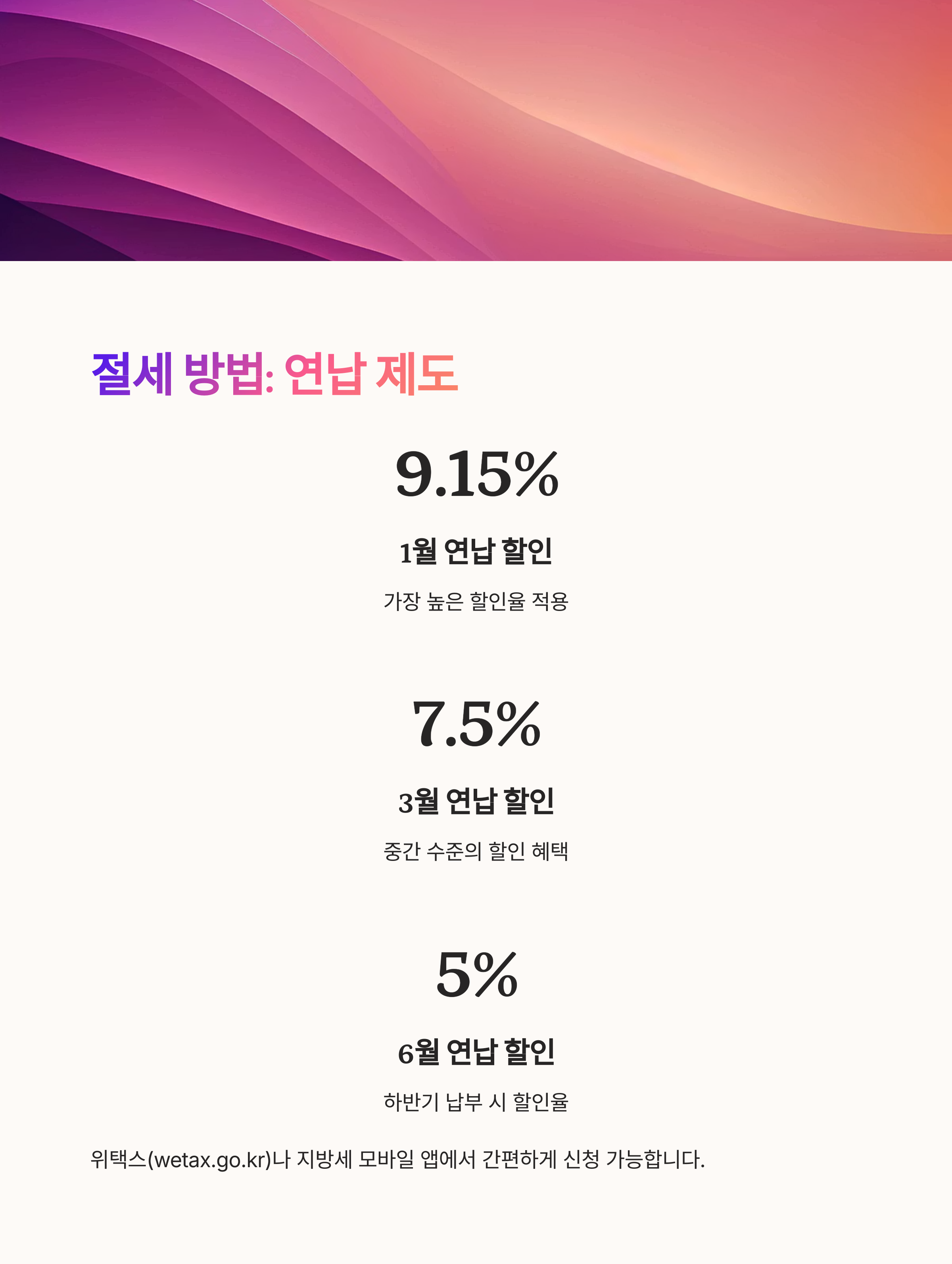 | 연납 (3월) | 매년 3월 | 7.5% | 1월보단 낮은 할인 |