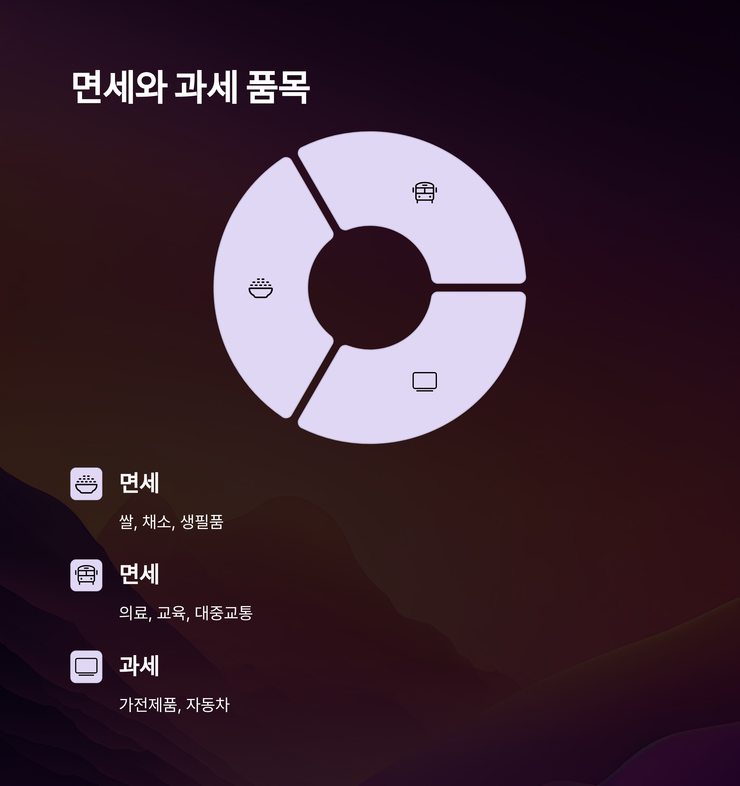 다만 모든 품목에 부가가치세가 붙는 건 아니에요. 쌀, 채소, 생선 같은 생필품은 면세 품목으로 분류돼요. 의료, 교육, 대중교통도 대부분 면세 항목이죠. 이런 품목은 국민의 생활에 꼭 필요한 서비스이기 때문에 세금을 면제해주는 거예요.