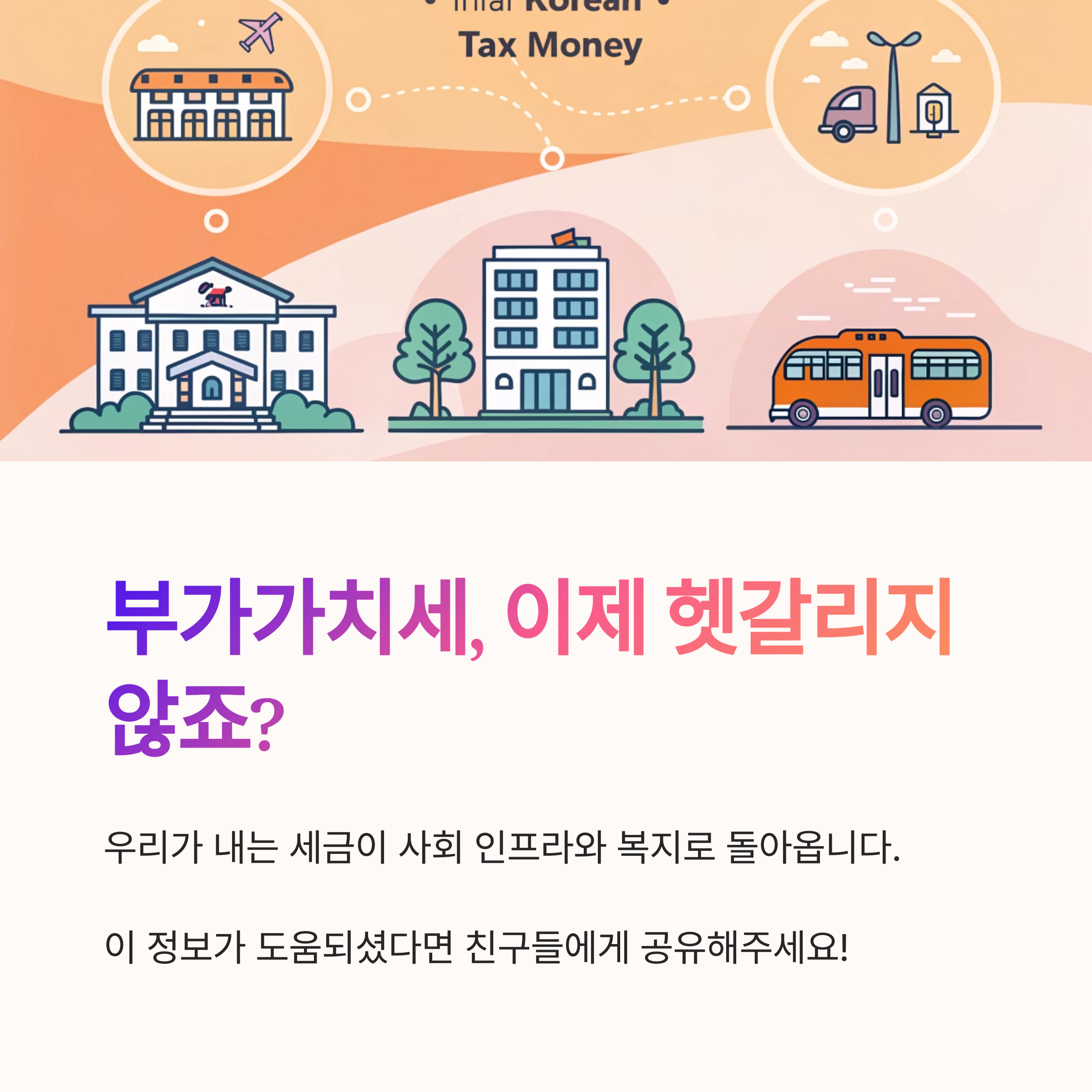 결국 우리는 하루에도 몇 번씩 부가가치세를 내고 있는 거예요. 이 세금이 모여서 나라의 복지, 공공서비스 예산으로 쓰이니, 우리가 낸 세금이 다시 우리 삶으로 돌아오게 되는 셈이죠. 🌍