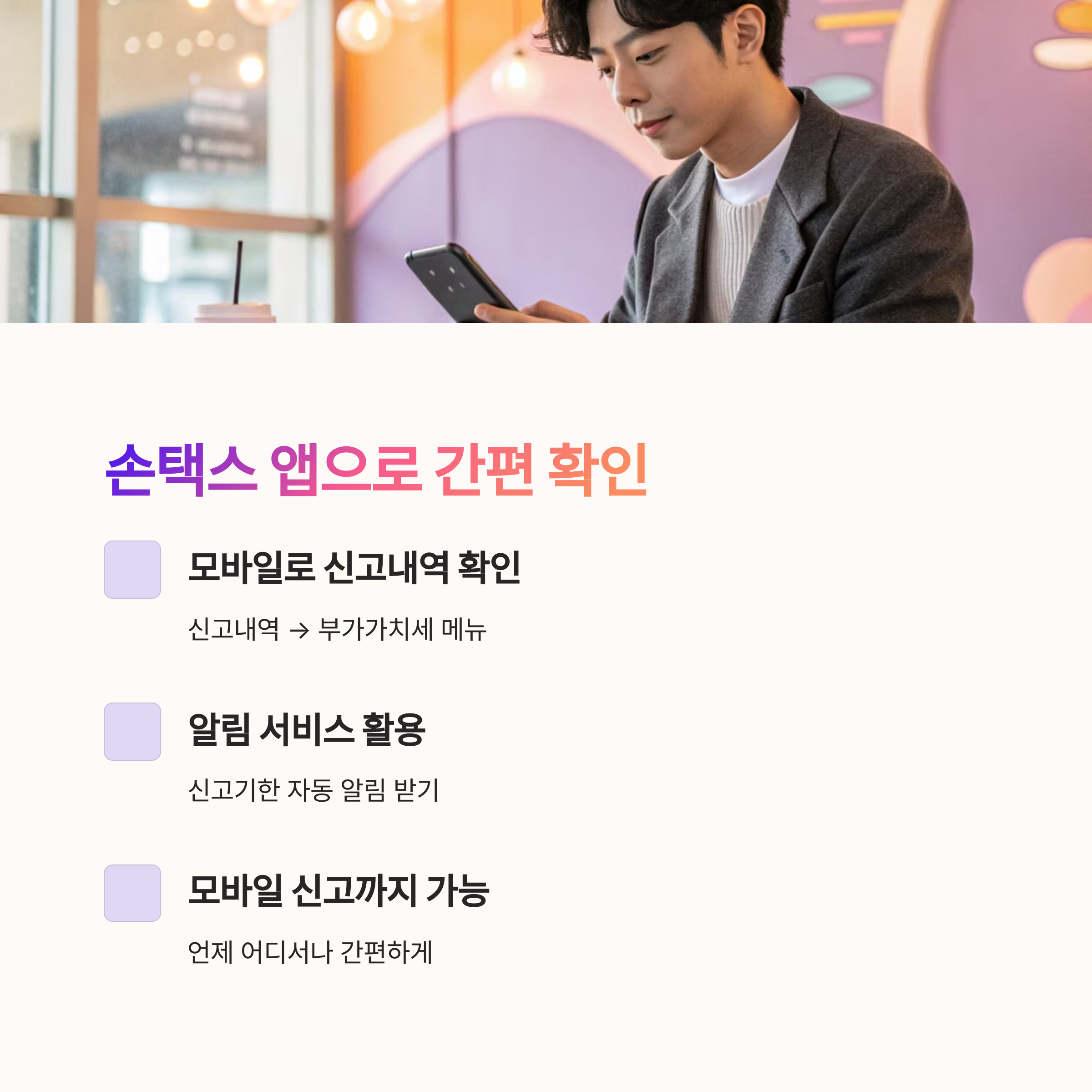 손택스 앱에서는 [신고내역] → [부가가치세] 메뉴에서 신고 예정 및 기간 정보를 빠르게 확인할 수 있어요. 요즘은 모바일로 신고까지 가능하니 편리하죠!