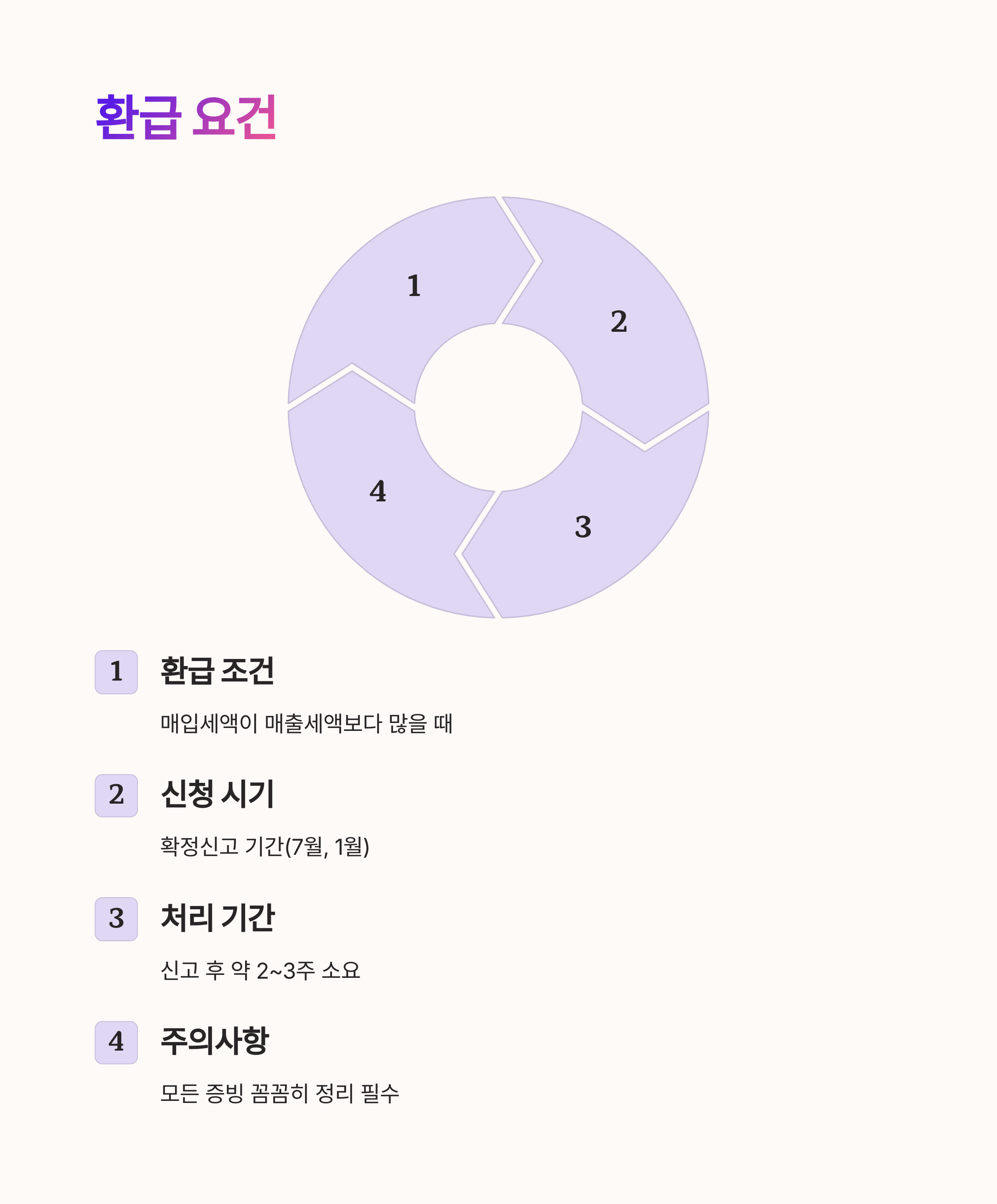 환급은 일반적으로 부가가치세 확정 신고 기간에 맞춰 진행되며, 1기 확정신고(7월)나 2기 확정신고(1월) 때 가능해요. 제출 이후 심사를 거쳐 약 2~3주 후에 등록된 계좌로 환급금이 들어와요. 홈택스에서 진행상황을 확인할 수도 있답니다.