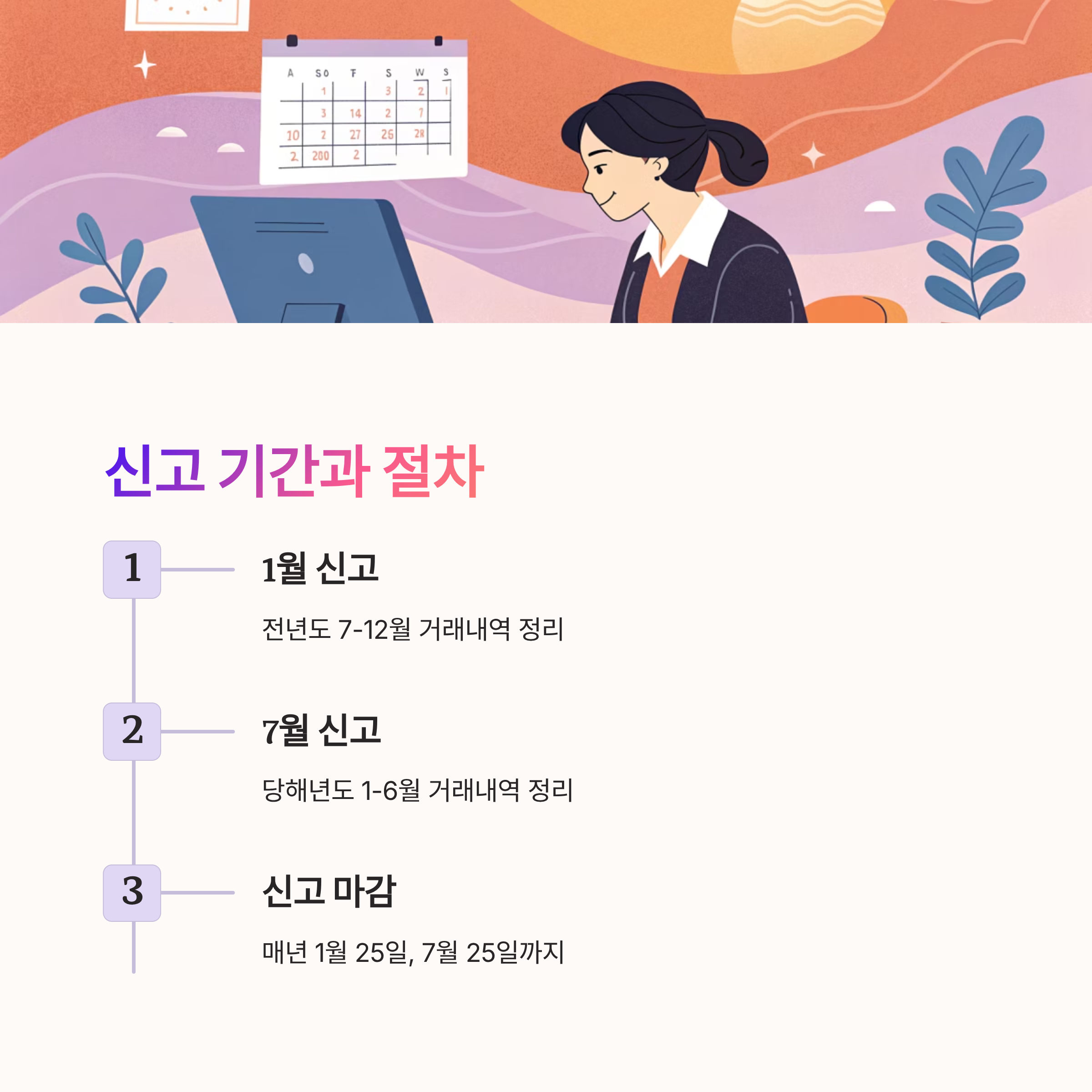 신고 기간은 보통 1월 1일부터 25일, 7월 1일부터 25일까지예요. 이 기한 안에 반드시 신고와 납부가 동시에 이루어져야 해요. 만약 이 기한을 놓치면 무신고 가산세와 납부 지연 가산세가 붙기 때문에 사업자 입장에서는 꼭 챙겨야 하는 중요한 일정이에요.