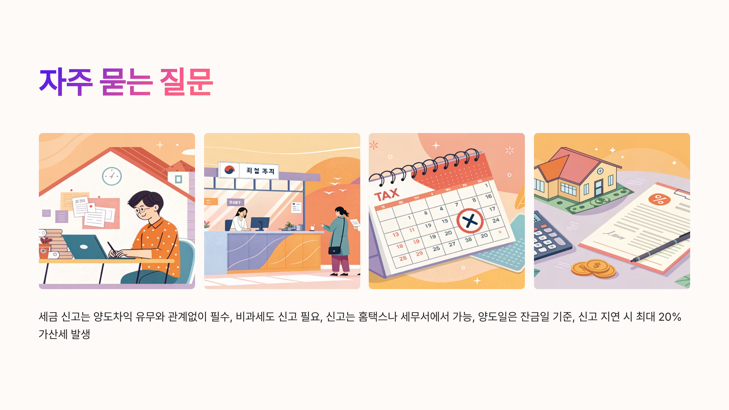 A1. 네, 양도차익이 있든 없든, 비과세 대상이든 아니든 ‘반드시’ 신고는 해야 해요. 미신고 시 가산세가 부과될 수 있어요.