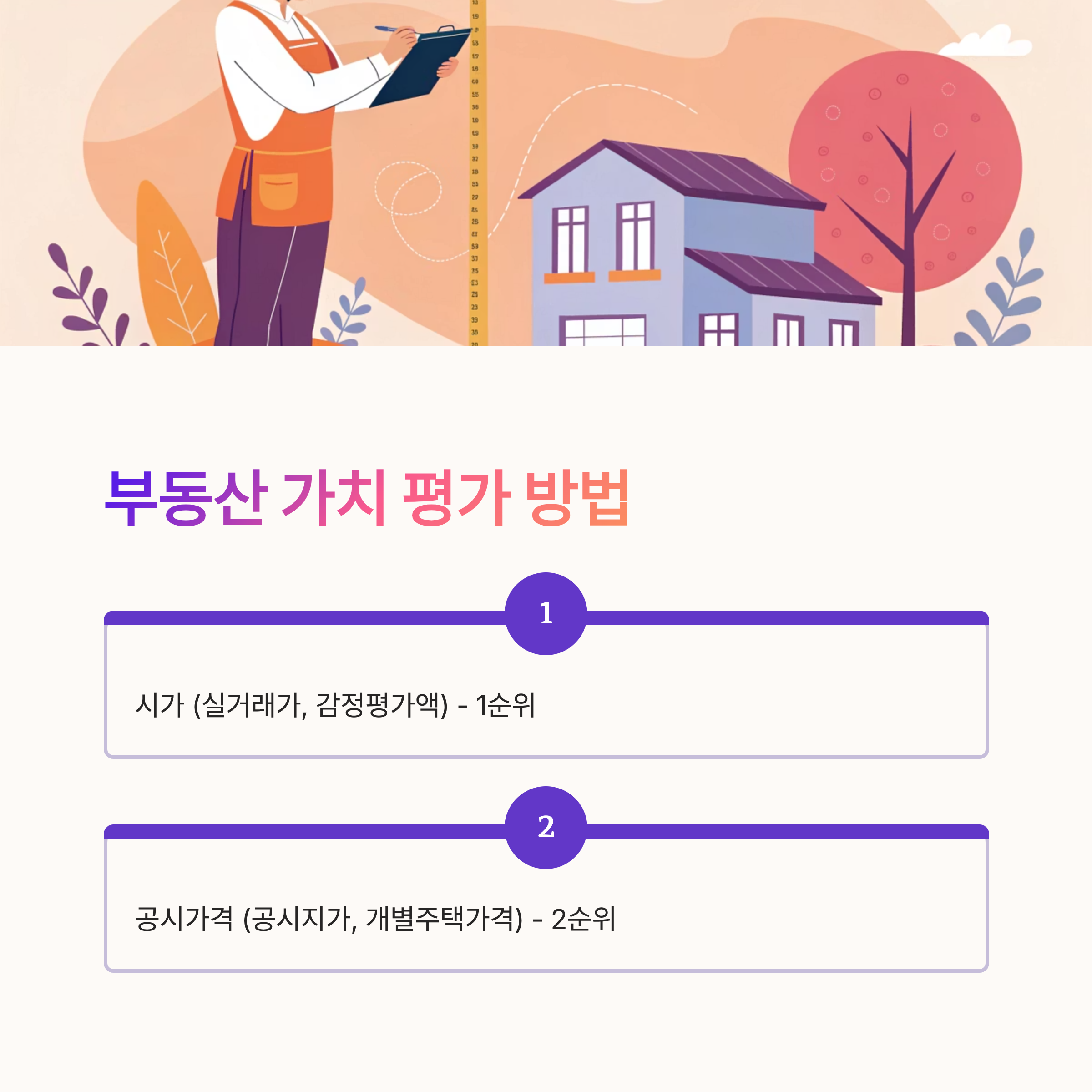 만약 2채 이상 부동산이 있다면 각각 따로 평가해서 합산해야 해요. 감정평가를 받는 경우 두 개 이상의 기관에서 감정한 평균값을 적용해요.
