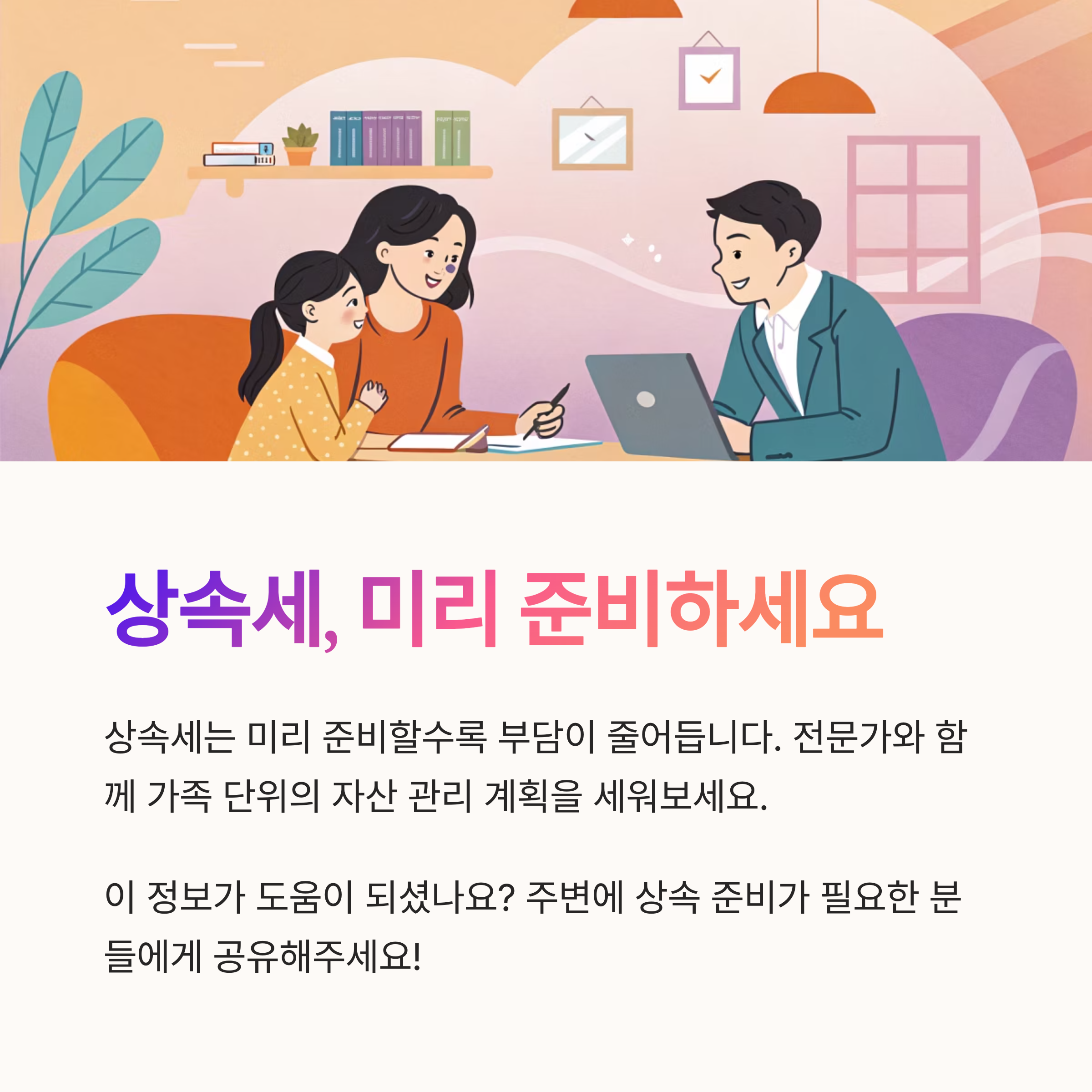 절세를 위해 중요한 건 미리 준비하는 자세예요. 증여 시기, 공제 활용, 명의 정리 등은 갑자기 준비하려면 어려울 수 있어요. 전문가와 함께 ‘가족 단위’의 자산 관리 계획을 세우는 것이 가장 현명하답니다!