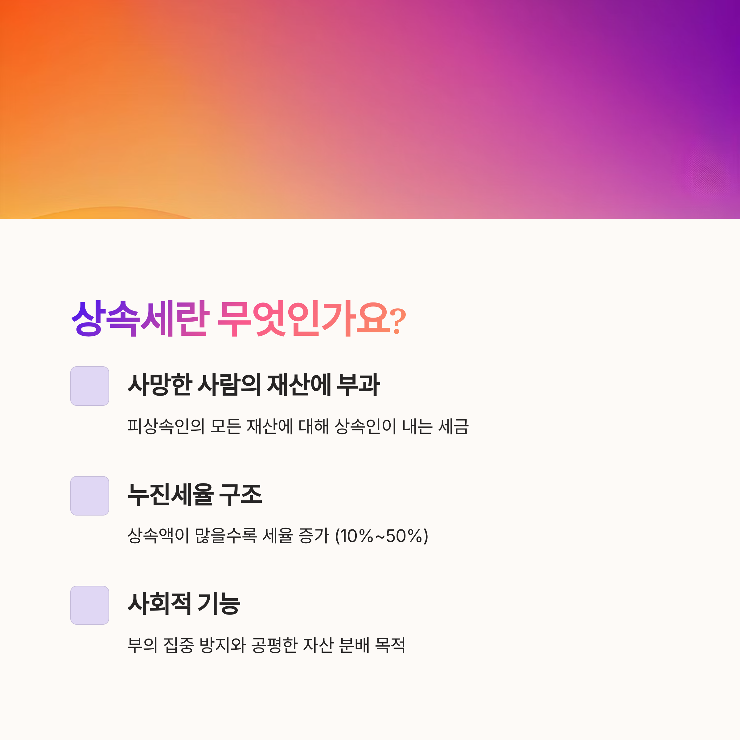 상속세는 사망한 사람(피상속인)이 남긴 재산을 상속인이 받을 때 부과되는 세금이에요. 즉, 부모님이나 친척이 돌아가시고 나서 재산을 물려받게 되면, 그 가액에 따라 일정 비율의 세금을 내야 하는 것이죠.
