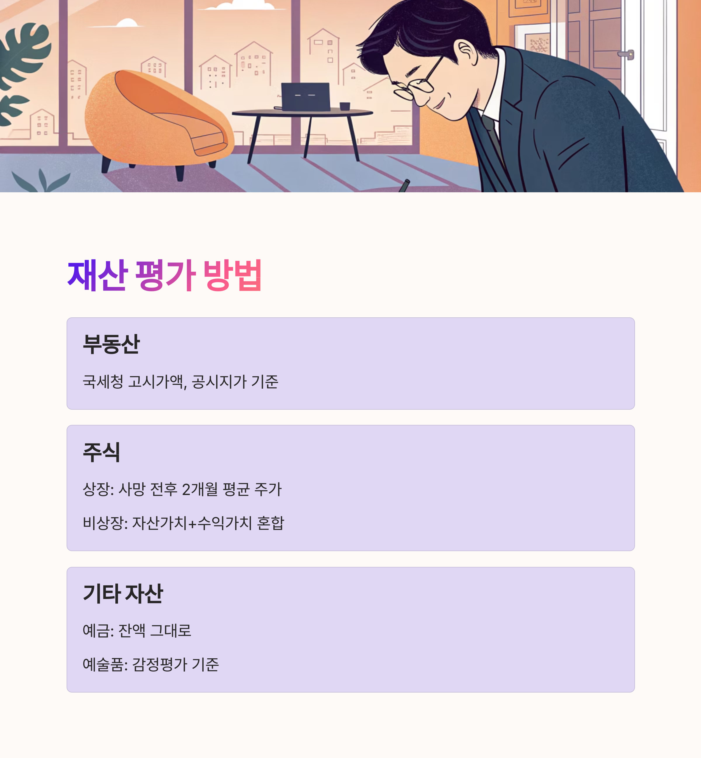 예를 들어, 부동산의 경우 국세청 고시가액이나 공시지가를 기준으로 하고요. 상장주식은 사망일을 기준으로 전후 2개월간 평균 주가를 사용해요. 비상장주식은 자산가치와 수익가치를 혼합한 평가 방식이 쓰여요.