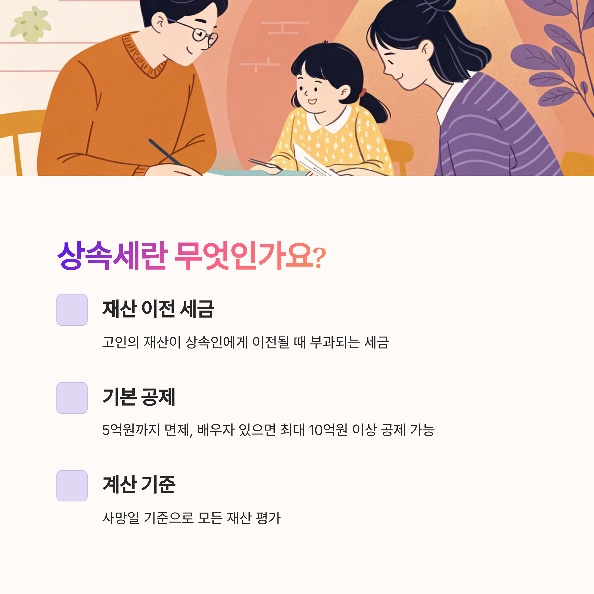 이처럼 상속세는 단순히 부자만 내는 세금이 아니라, 일정 수준 이상의 자산이 있다면 누구나 대상이 될 수 있기 때문에 미리 알아두는 게 좋아요.