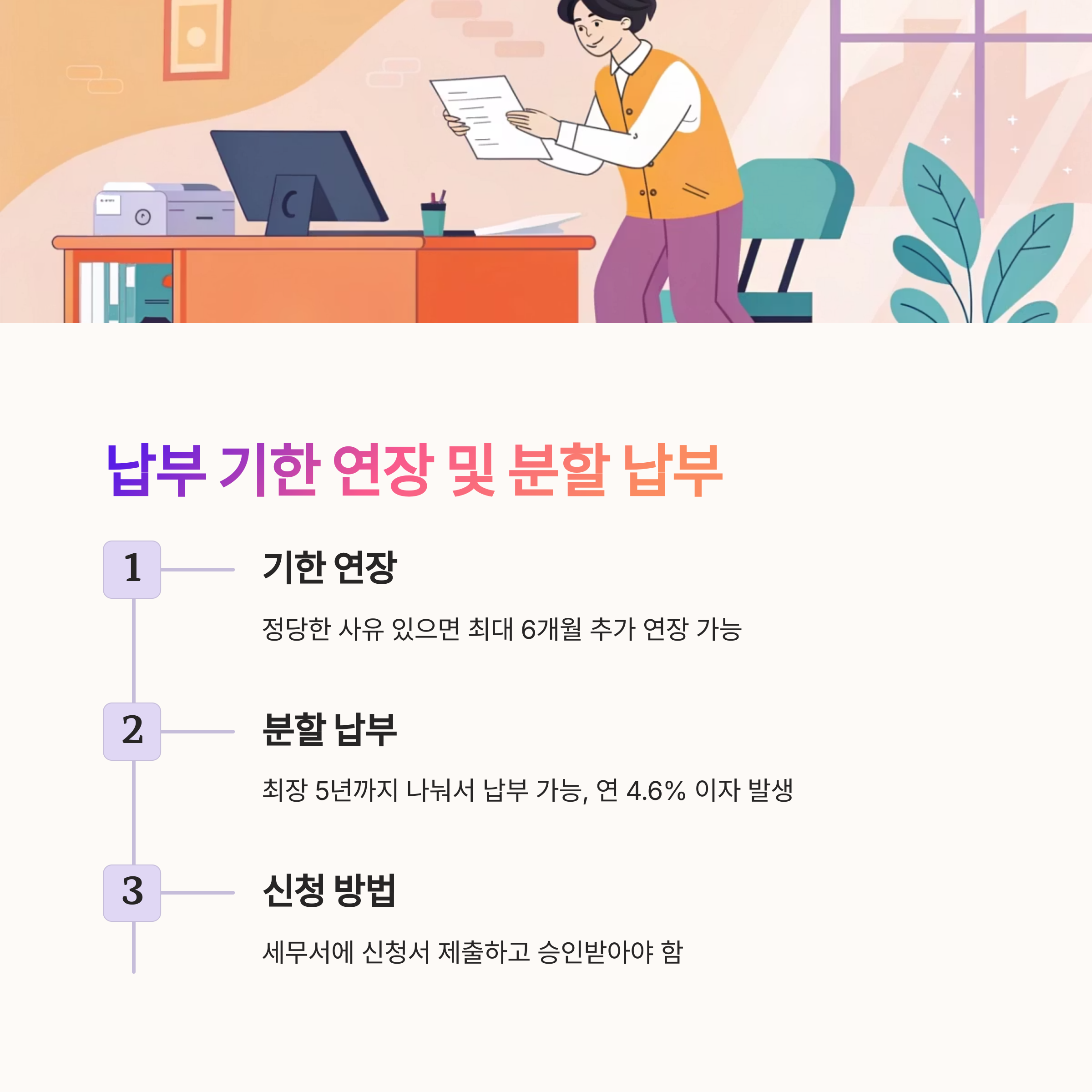 | 연장 납부 | 최대 6개월 | 정당한 사유 필요 | 부과 안됨 |