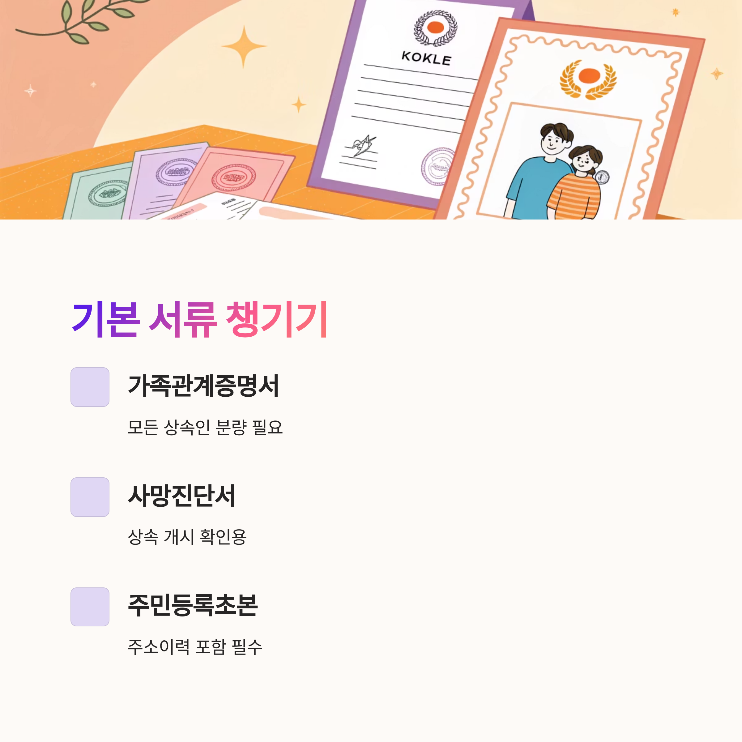 A3. 가족관계증명서, 사망진단서, 주민등록초본은 필수예요. 등기부등본이나 계좌 정보도 함께 있으면 더 좋아요.