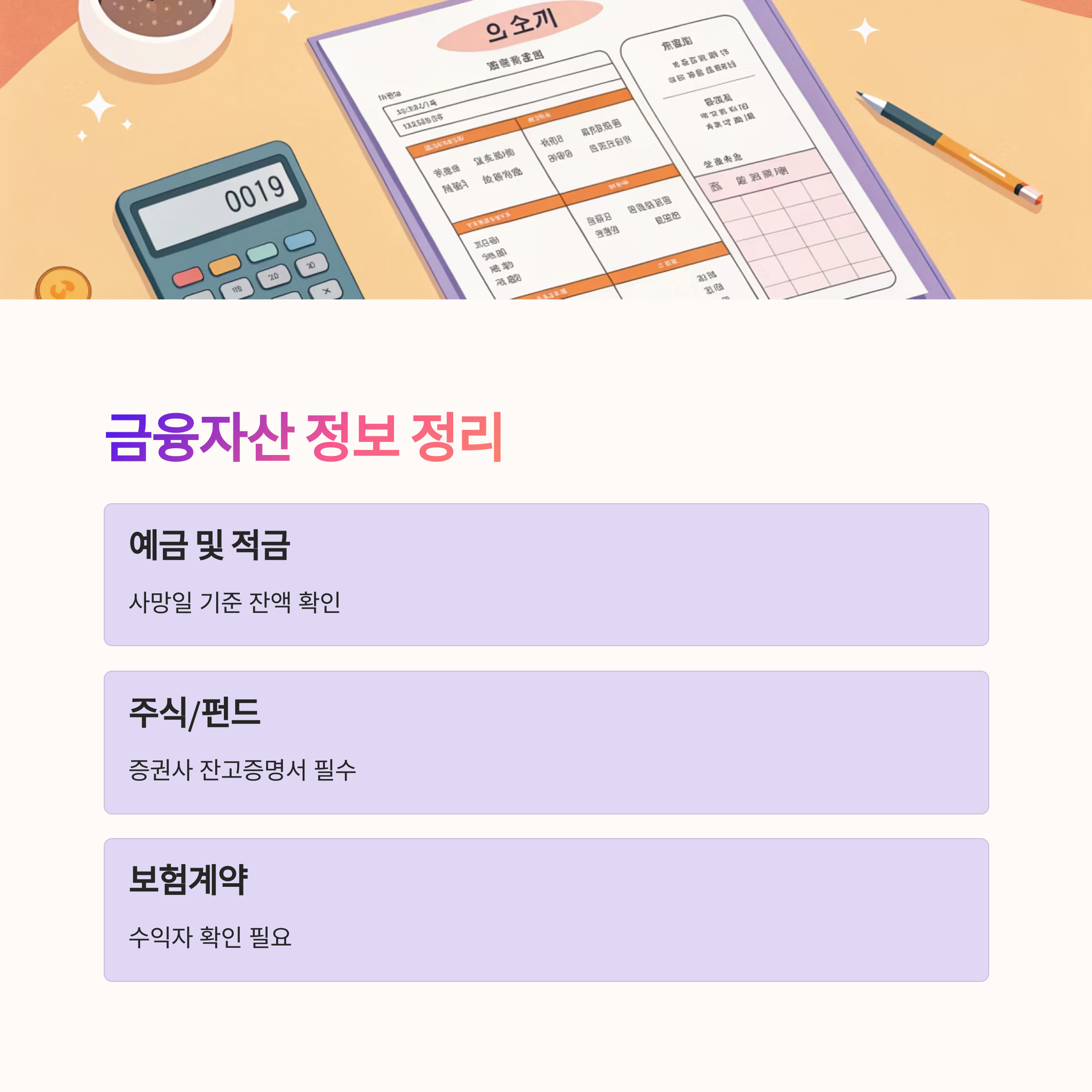 예금 및 적금 계좌는 계좌번호, 예치 금액, 개설일자 등을 정확히 파악하는 것이 필요해요. 또한 피상속인이 주식이나 펀드를 보유하고 있었다면, 거래 증권사에서 잔고 증명서를 발급받아 제출해야 한답니다. 상속세는 '사망일 기준 평가액'으로 계산되므로, 당시 시세 기준 자료가 필요해요.