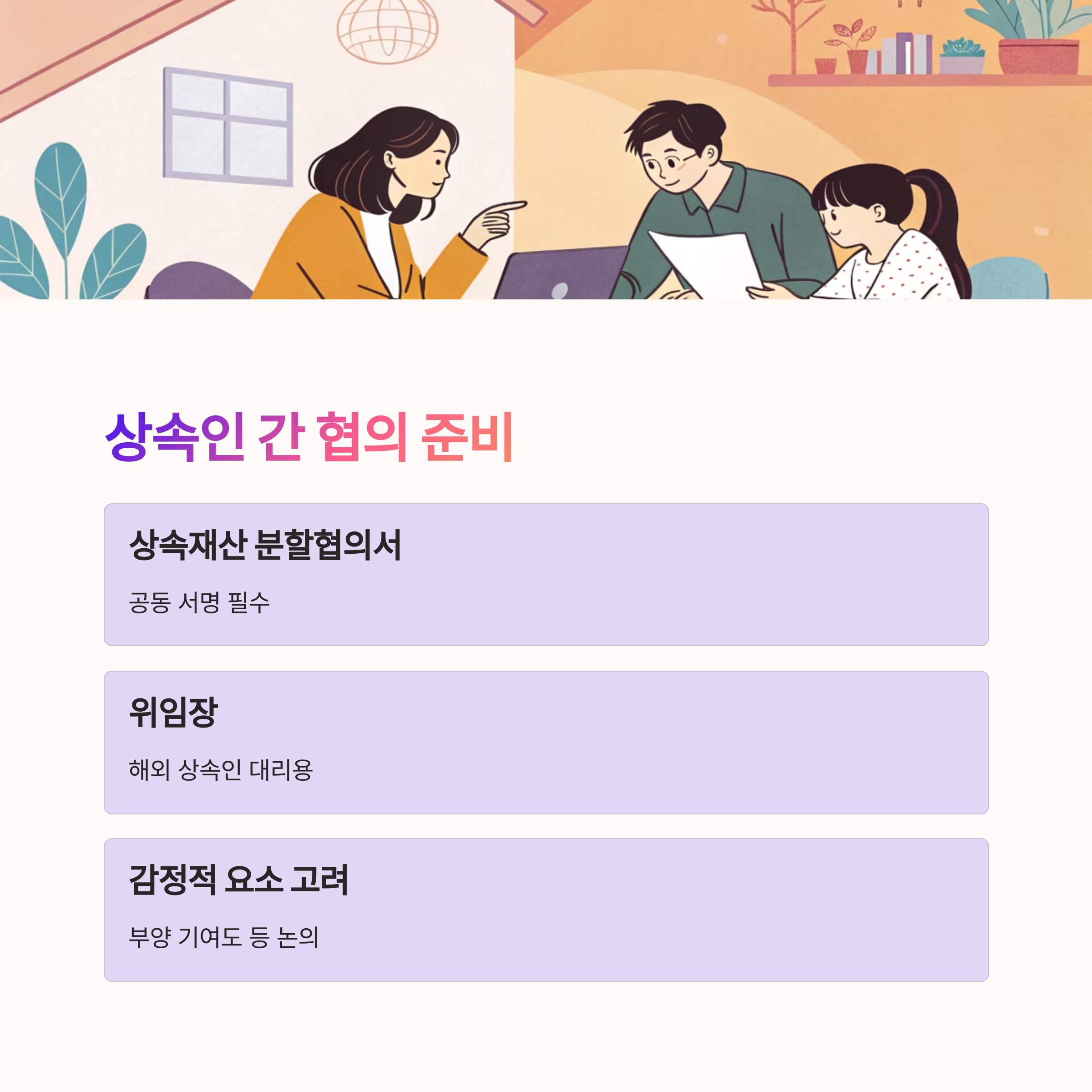 상속이란 단순한 자산 이전을 넘어서 '가족 간의 합의'가 필요한 민감한 과정이에요. 따라서 상속인들 간의 사전 협의는 상담 전 꼭 준비해야 할 부분 중 하나예요. 누가 어떤 자산을 얼마큼 가져갈 것인지 미리 합의되지 않으면 전문가도 조언을 드리기가 힘들 수 있어요.