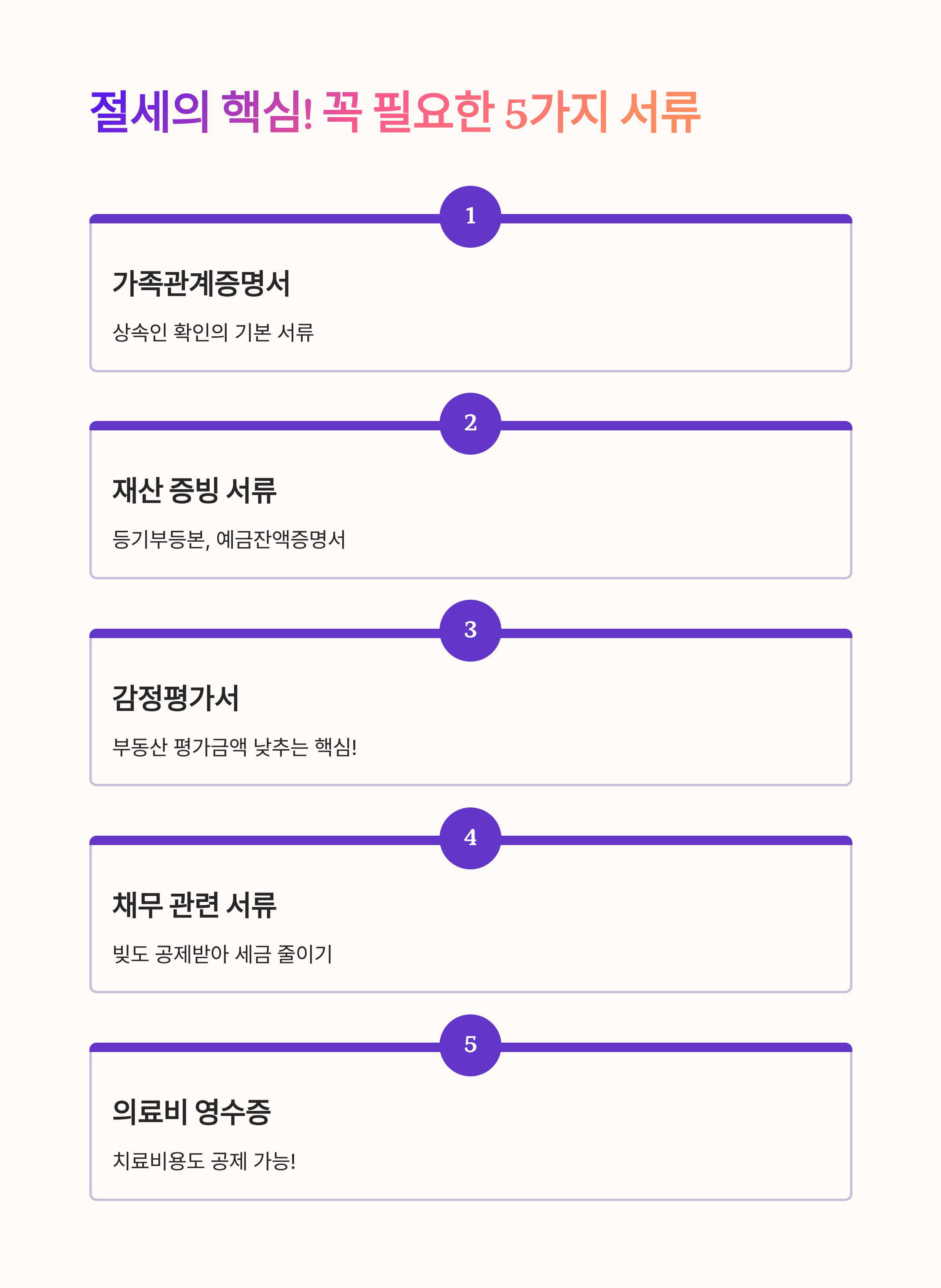 상속세 절세를 위해서는 단순히 ‘재산이 얼마나 되는지’만 알아서는 부족해요. 국세청에 제출할 수 있는 다양한 증빙 서류가 필요하고, 이 서류들을 정확히 갖추는 것이 절세의 핵심이에요. 상속인의 입장에서 보면 이 서류들이 곧 ‘법적 근거’가 되는 셈이죠.