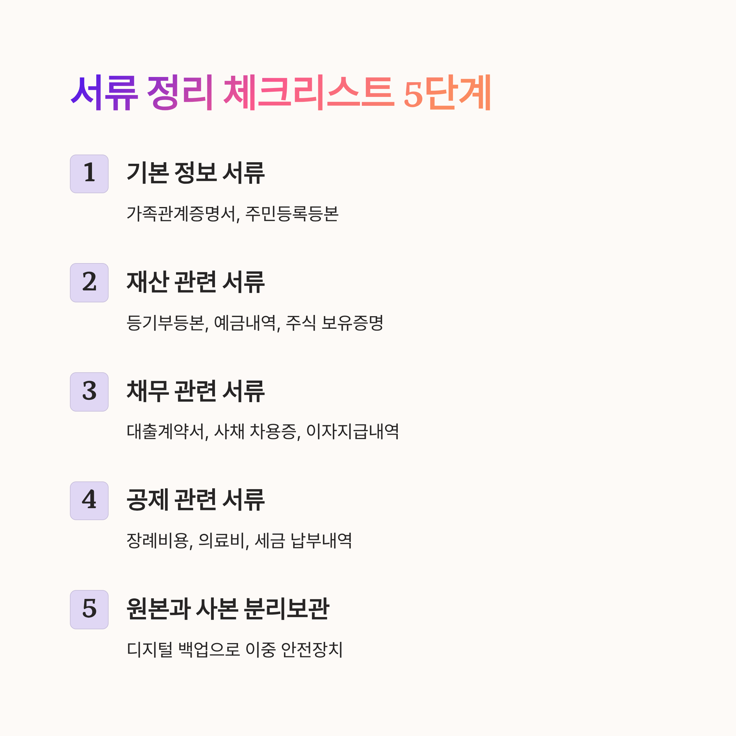 사망 직후에는 사망진단서와 가족관계증명서를 빠르게 확보하는 것이 중요해요. 이때, 금융기관과 법원에 제출할 서류들이 겹치기 때문에 원본과 사본을 여러 부 준비해두면 유용해요. 특히 재산에 관한 서류는 통합 정리가 필요해서, 체크리스트를 만들어두면 효율적으로 처리할 수 있어요.
