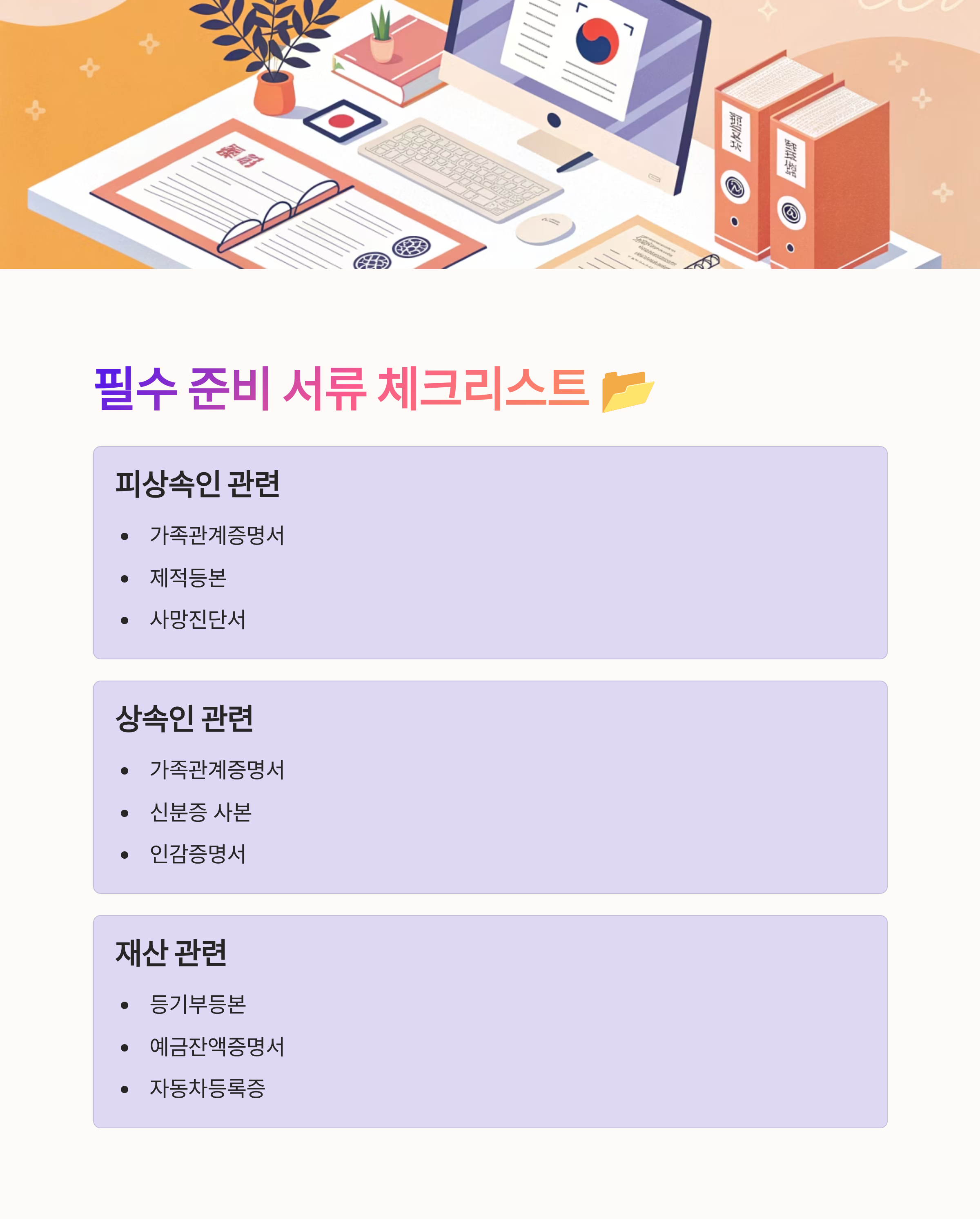 | 2. 재산 목록 작성 | 상속대상 재산 정리 | 등기부등본, 통장사본 등 |