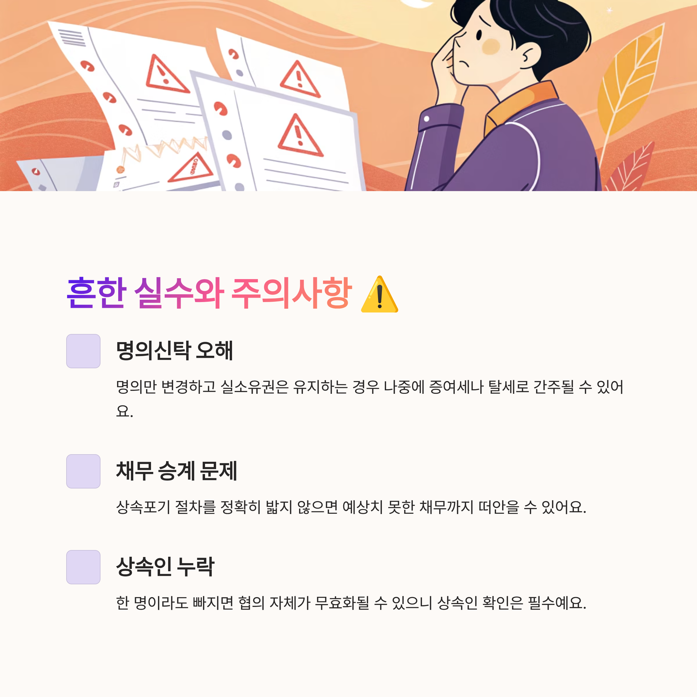 상속은 돈보다 감정이 얽히는 영역이에요. 실제로는 금액보다 "왜 나에게 얘기 안 했냐", "왜 혼자 처리했냐"는 감정 싸움으로 번지는 경우가 많아요. 그래서 최대한 투명하고 공정한 절차를 통해 서로 신뢰를 쌓는 것이 가장 중요한 예방책이죠.