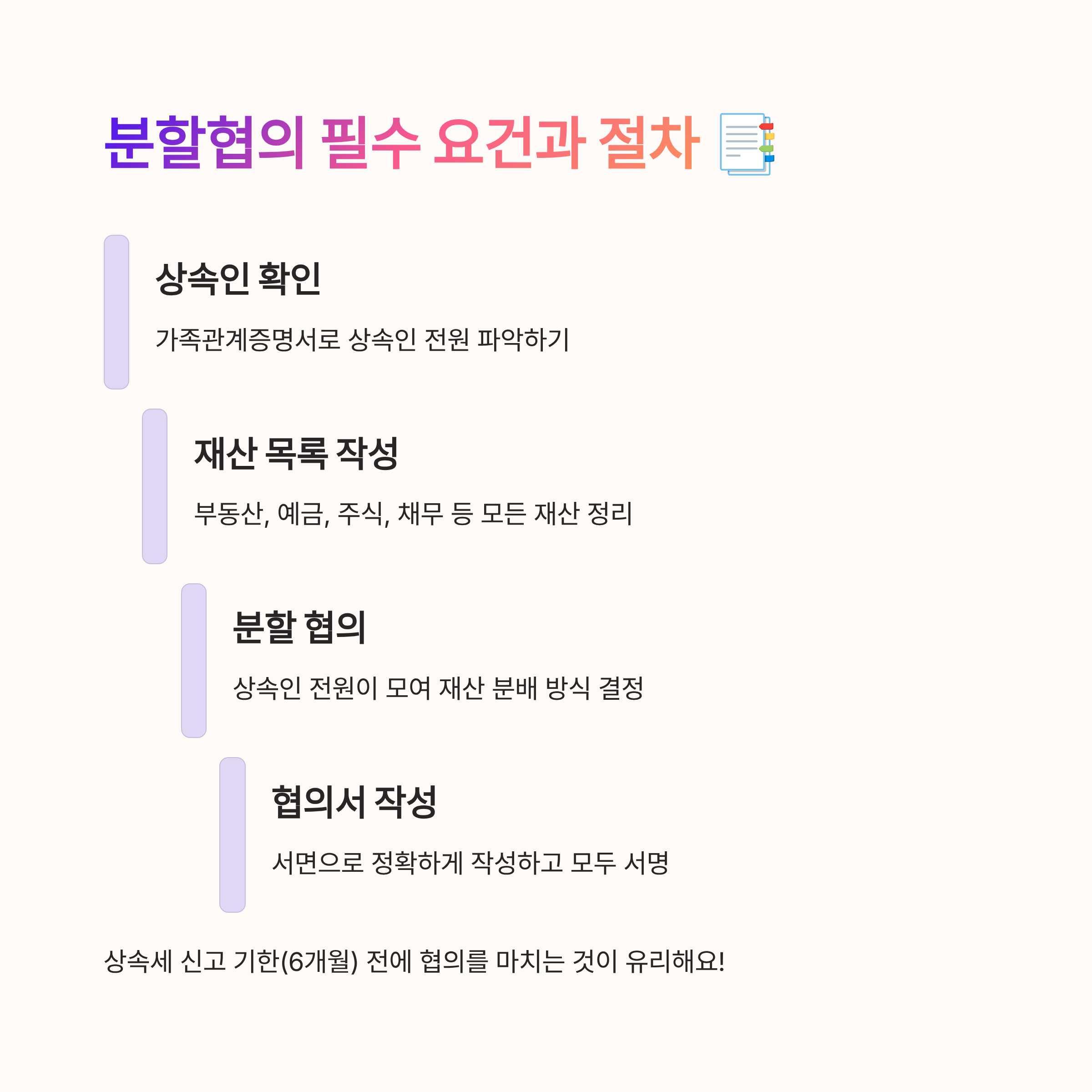 | 3. 분할 협의 | 상속인 전원이 합의 | 분할협의서 초안 |