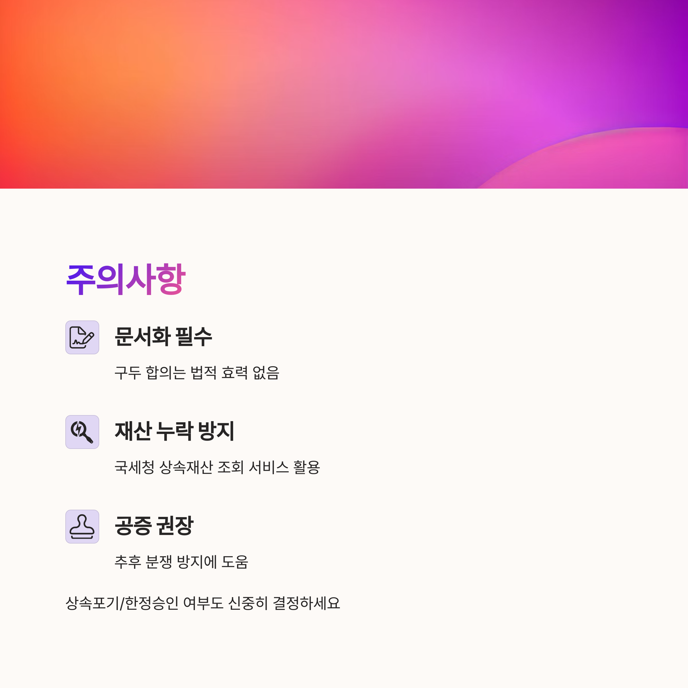 상속재산 분할협의는 형식적 절차가 아니라, 가족 간의 재산 분배라는 민감한 주제를 다루는 만큼 반드시 ‘신중하게’ 진행해야 해요. 첫 번째로 중요한 건 ‘문서화’예요. 구두로 아무리 합의해도 법적 효력은 없고, 향후 분쟁의 소지가 될 수 있답니다.