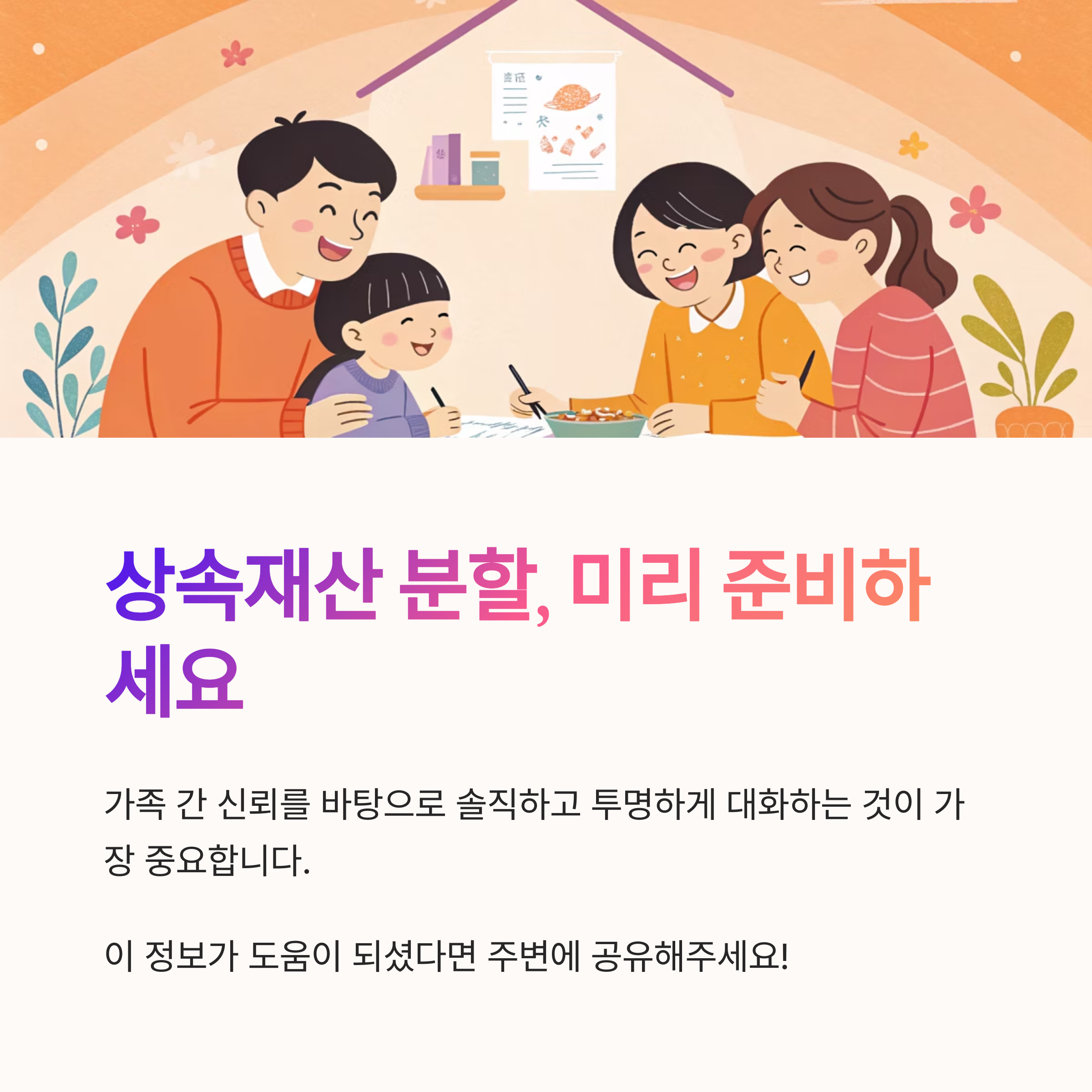 내가 생각했을 때 가장 중요한 점은, ‘형제자매간 신뢰’를 바탕으로 솔직하고 투명하게 대화하는 거예요. 감정이 개입되면 합의 자체가 어려워질 수 있거든요.