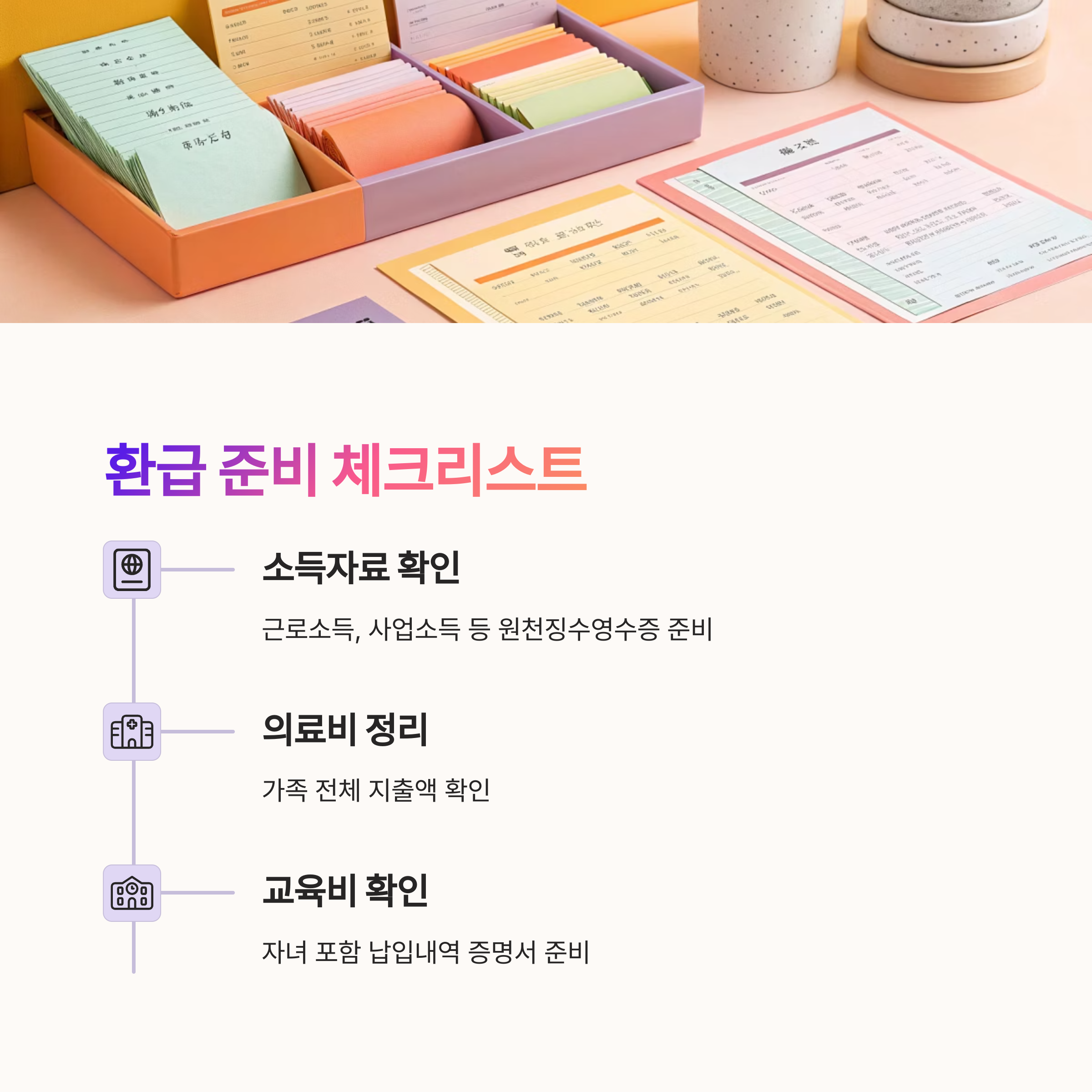 서류는 단순히 종이 한 장이 아니라, 환급의 핵심이 되는 증거자료예요. 그래서 준비와 제출 모두 실수 없이 꼼꼼하게 진행해야 해요. 소득세 환급에서 ‘종이 실수’는 바로 돈 손해로 이어진답니다. 🧾