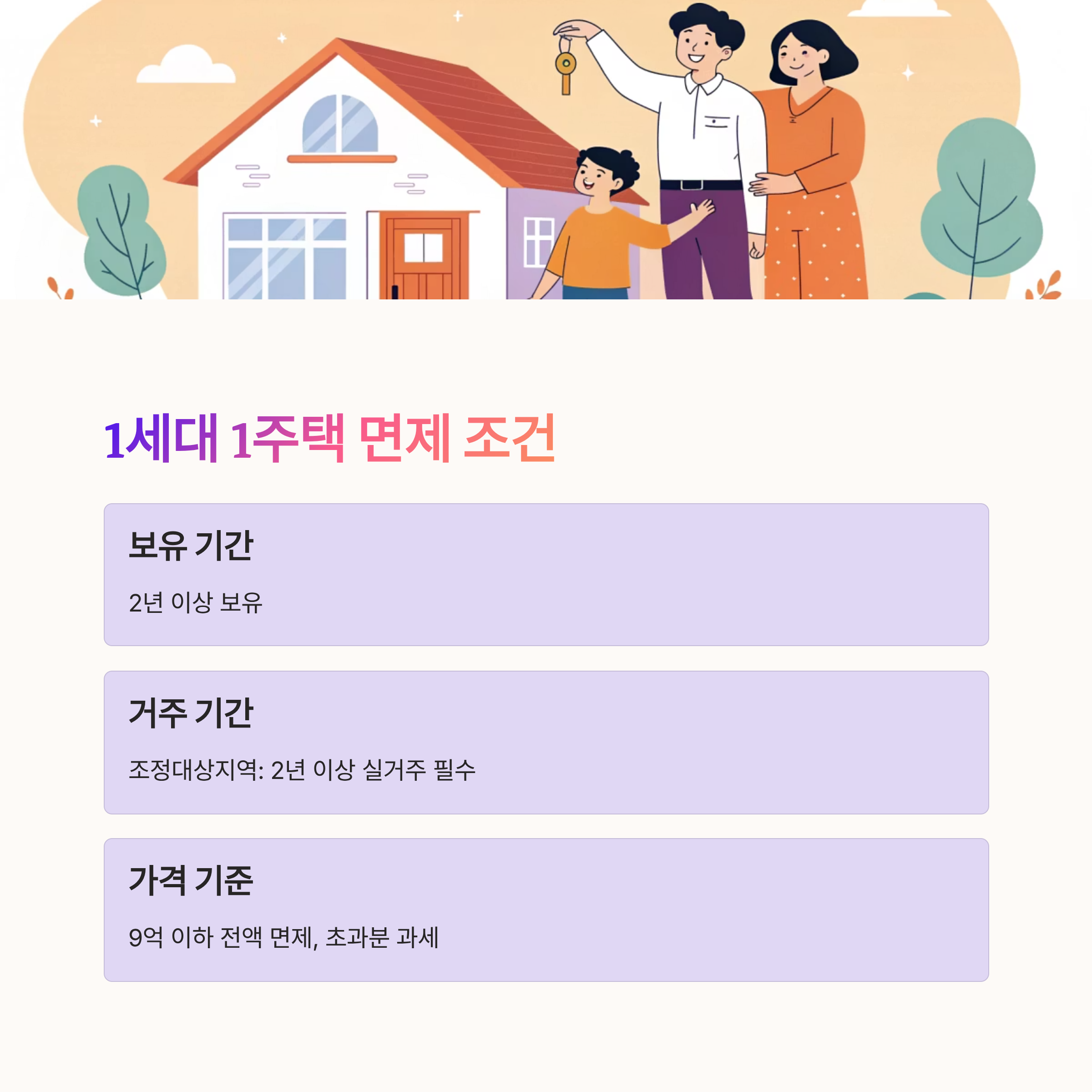 1세대 1주택 비과세는 가장 많이 활용되는 제도예요. 기본적으로 2년 이상 보유와 2년 이상 거주 조건을 충족해야 하고, 양도 당시 세대가 다른 주택을 소유하지 않아야 해요.