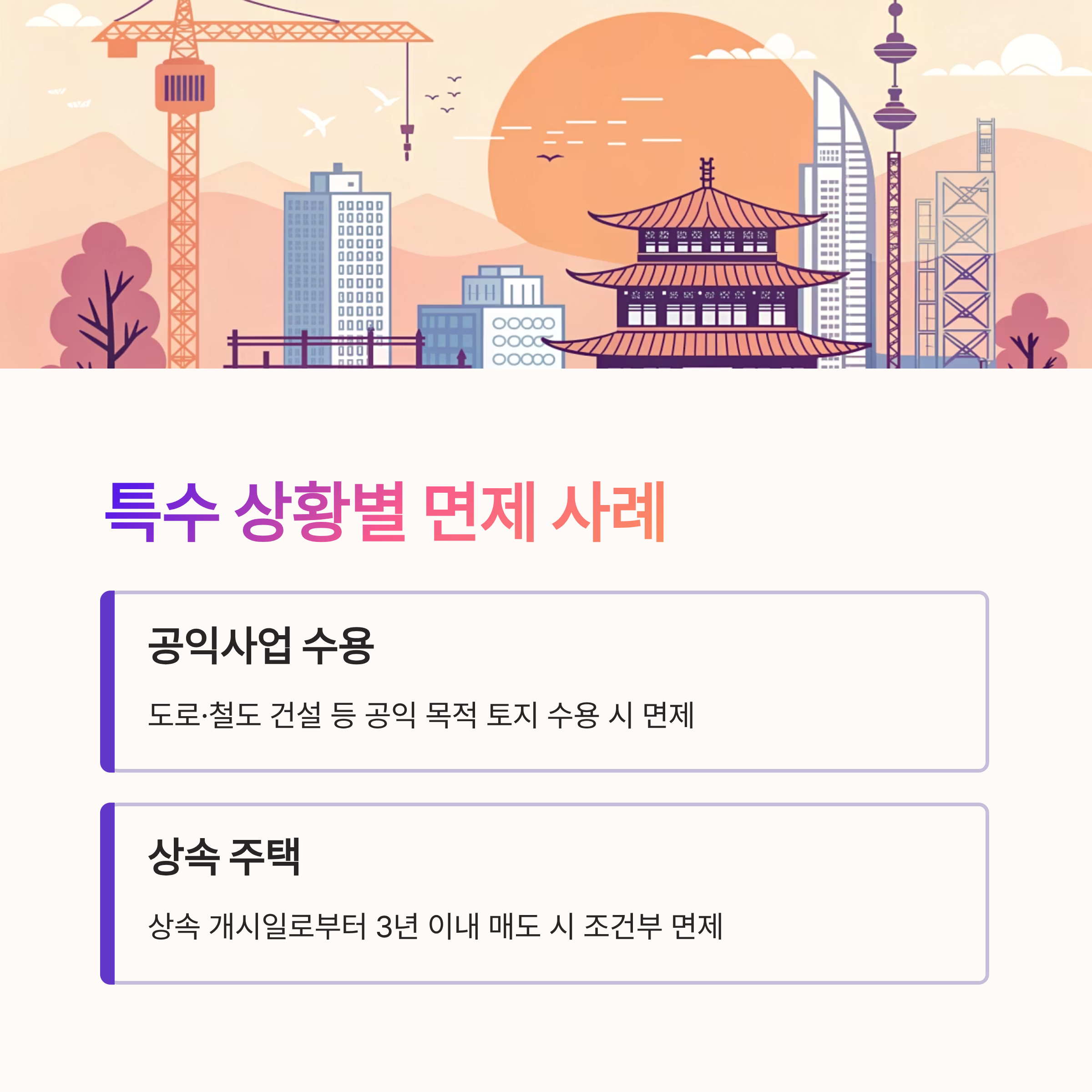 특수한 상황에서 양도소득세를 면제받을 수 있는 경우도 있어요. 예를 들어, 재개발·재건축 사업으로 인한 이주, 공익사업을 위한 토지 수용, 천재지변으로 인한 주택 손실 등이 여기에 해당돼요.