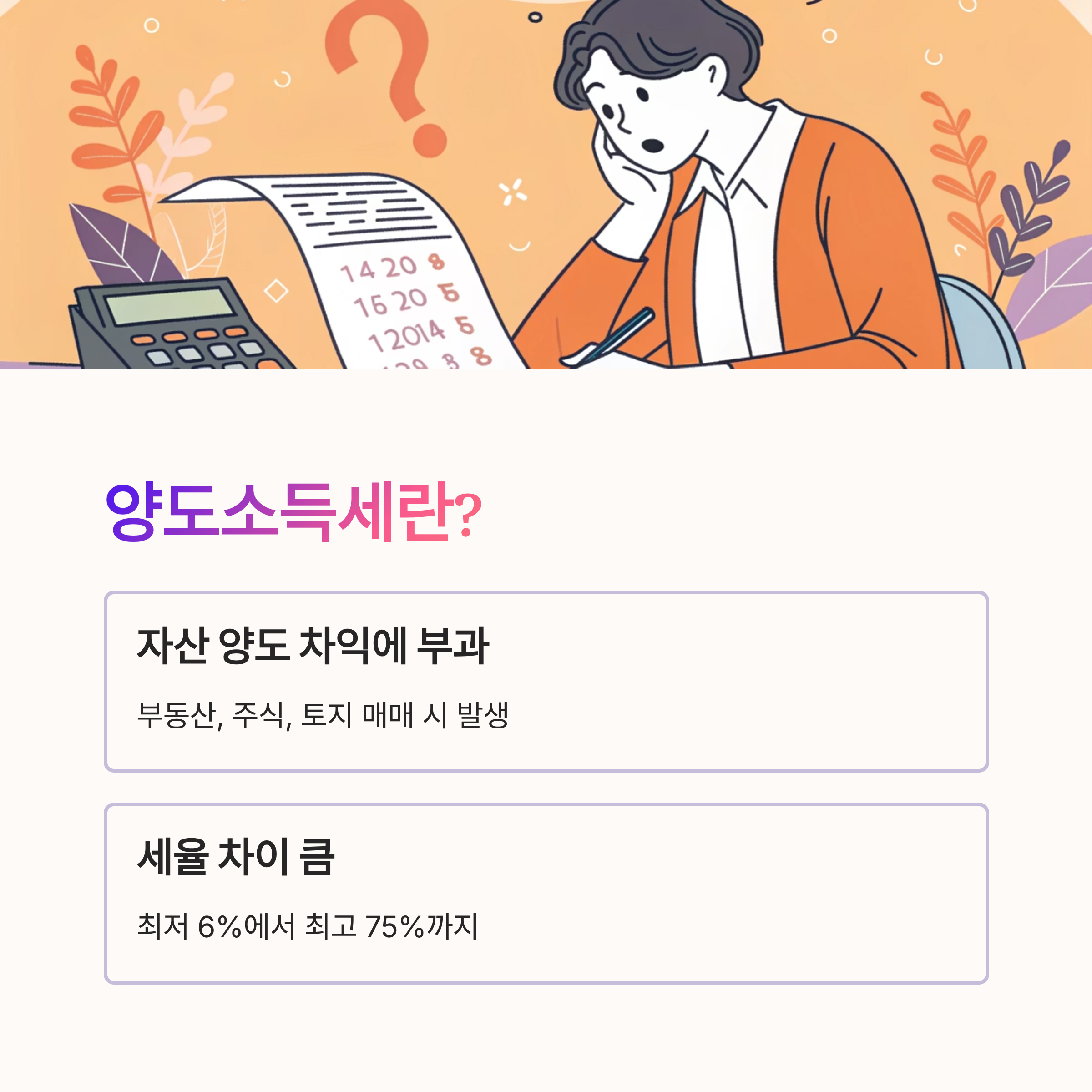 양도소득세는 부동산이나 주식, 토지 등 일정한 재산을 양도하여 발생한 차익에 부과되는 세금이에요. 여기서 '양도'란 단순한 매매뿐 아니라 증여, 교환, 경매 등 소유권이 이전되는 모든 형태를 포함해요. 세금은 양도차익에서 각종 필요경비와 기본공제를 뺀 금액에 세율을 곱해 계산해요.
