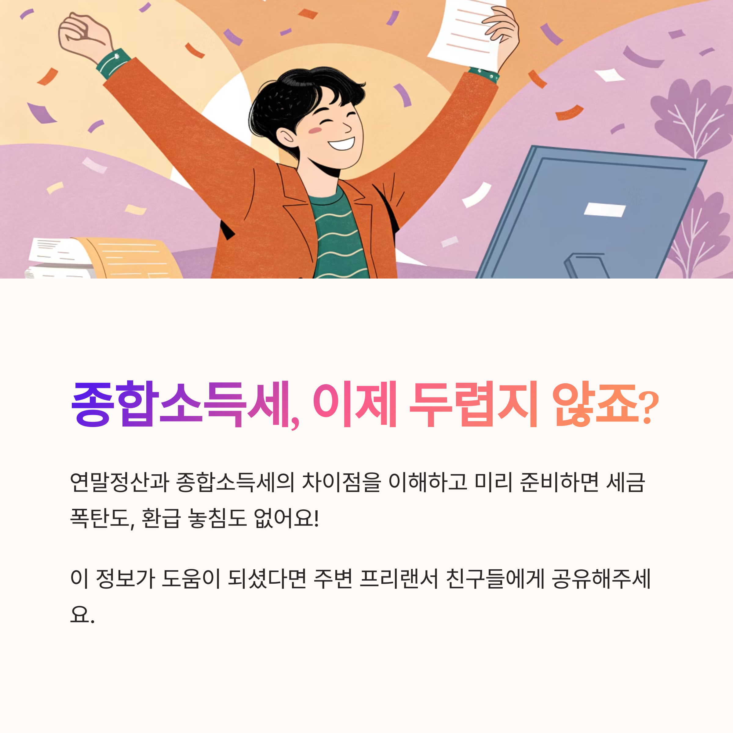 이처럼 두 제도는 성격도, 대상도, 방식도 전혀 달라요. 혹시라도 "나는 회사를 다니니까 끝났겠지" 하고 방심하면 안 돼요. 특히 투잡하거나 임대수익 있는 경우, 종합소득세 대상일 가능성이 높답니다. 🧾