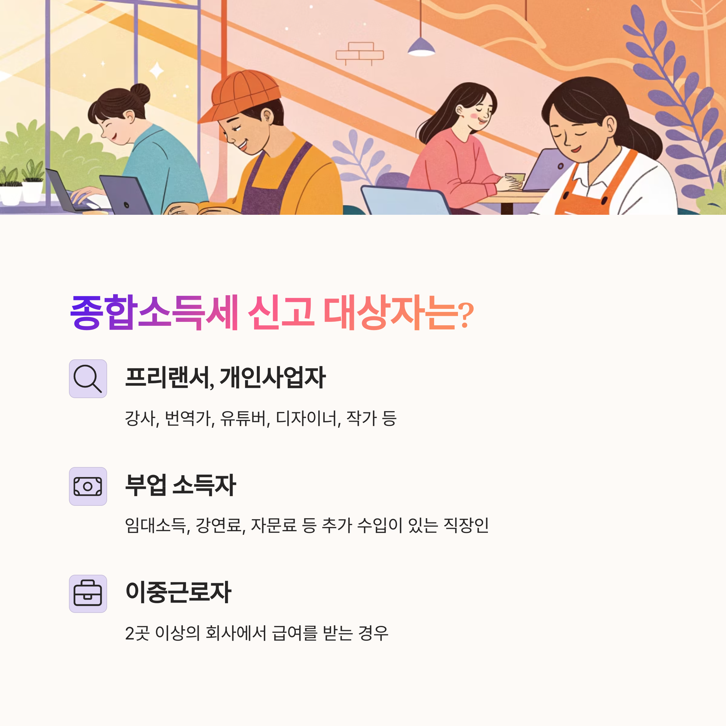 예를 들어, 프리랜서나 유튜버, 작가, 번역가처럼 고용된 회사 없이 일하는 사람은 연말정산 대상이 아니고, 종합소득세 신고를 꼭 해야 해요. 혹은 직장인이어도 부업으로 강의료나 임대소득 등을 벌었다면 역시 종합소득세 신고 대상자예요.