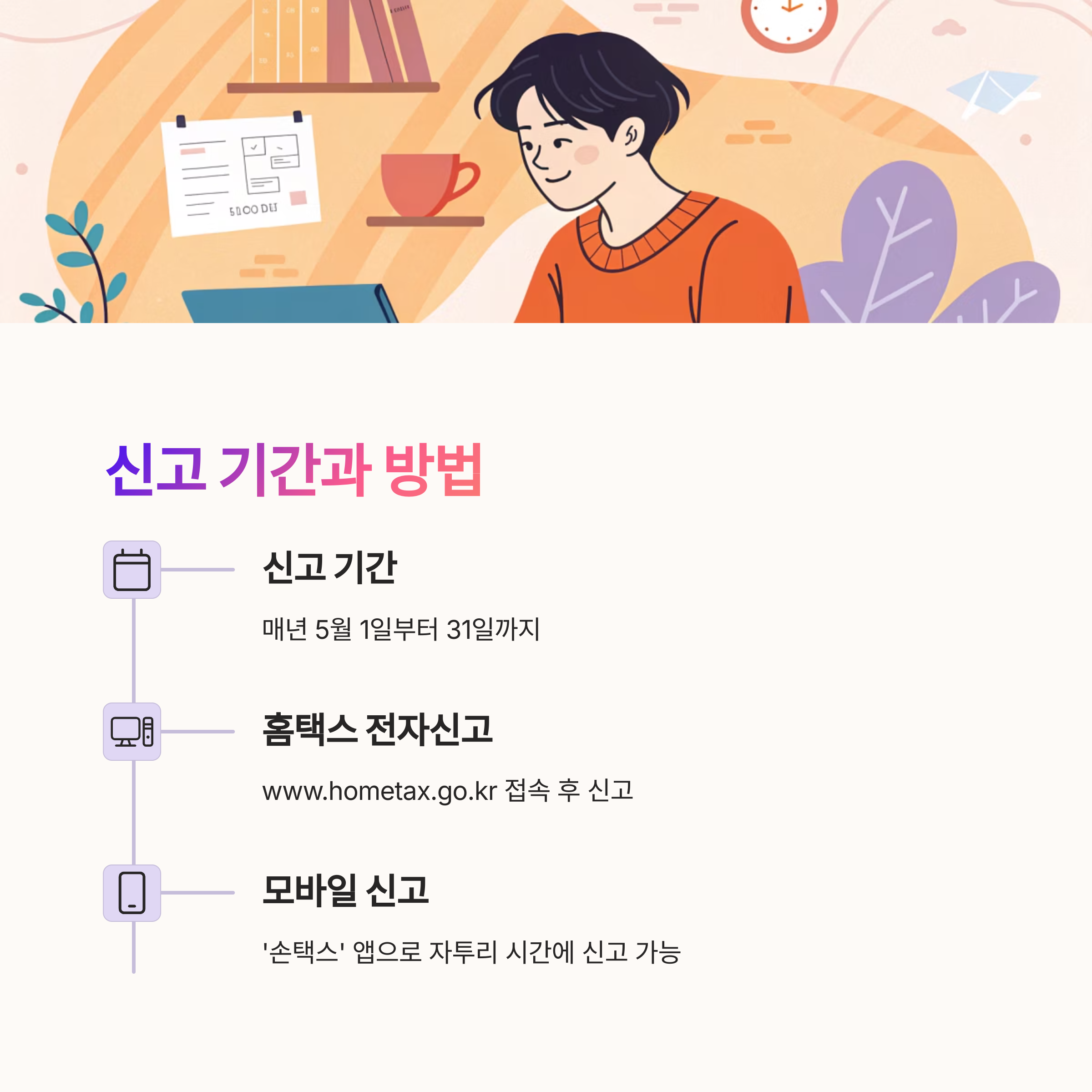 종합소득세는 매년 5월 1일부터 5월 31일까지 신고해야 해요. 이 한 달 동안 본인의 소득에 대해 자진신고하고, 세금도 납부해야 한답니다. 만약 이 기간을 넘기면 ‘무신고 가산세’와 ‘납부지연 가산세’가 붙게 되기 때문에 꼭 기억해둬야 해요!