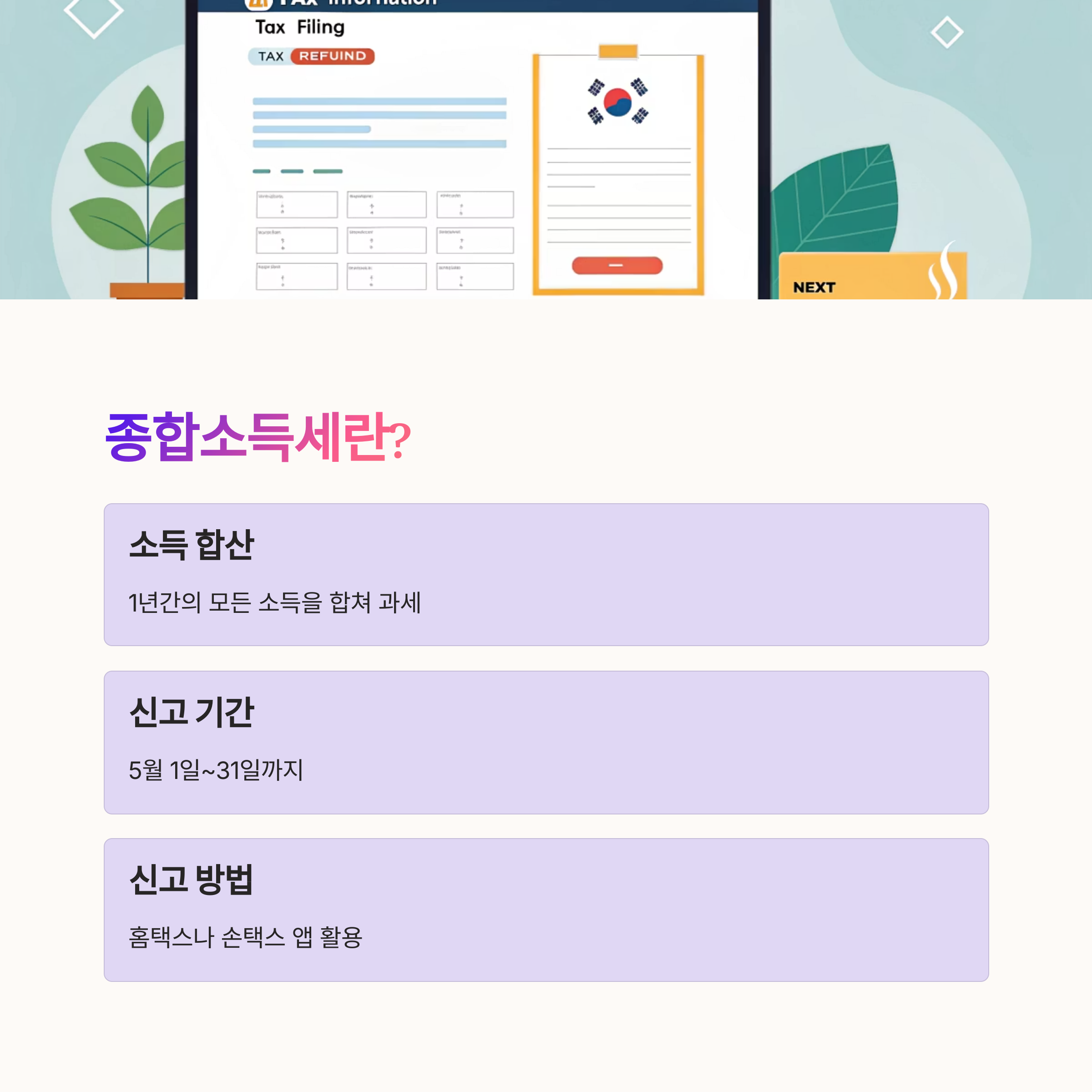 종합소득세는 자진신고가 원칙이기 때문에, 본인의 수입과 경비, 공제 항목 등을 꼼꼼히 챙겨야 절세 효과를 누릴 수 있어요. 특히 국세청 홈택스나 손택스(모바일) 앱을 활용하면 편리하게 신고할 수 있답니다.