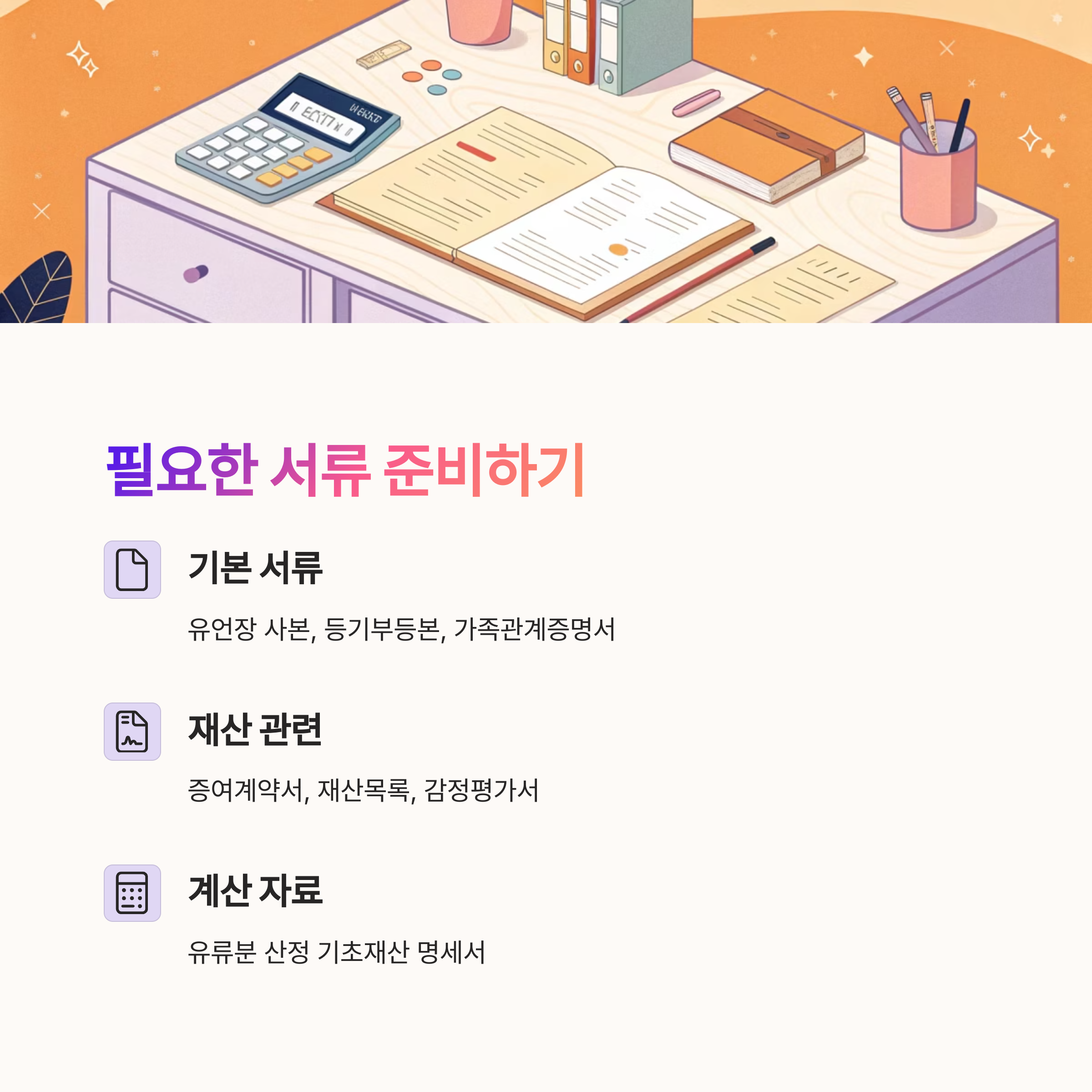 | 유언장 사본 | 상속재산 확인 | 공증 유무 중요 |