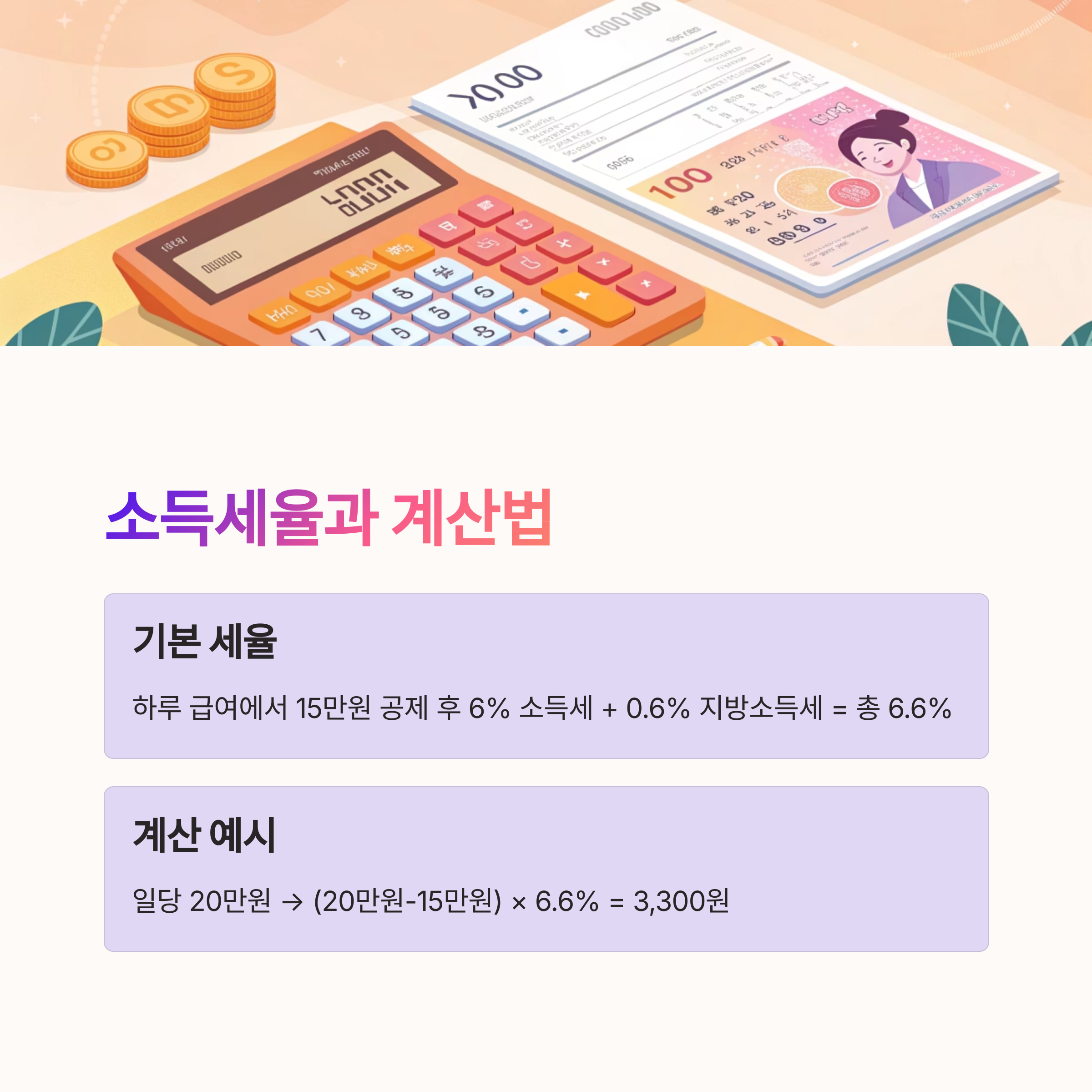 일용직 근로자의 소득세는 아주 단순하게 계산돼요. 기본적으로 하루 급여에서 15만원을 공제한 금액의 6%를 세금으로 계산해요. 여기에 지방소득세 0.6%가 추가돼서, 총 6.6%가 세율이죠.