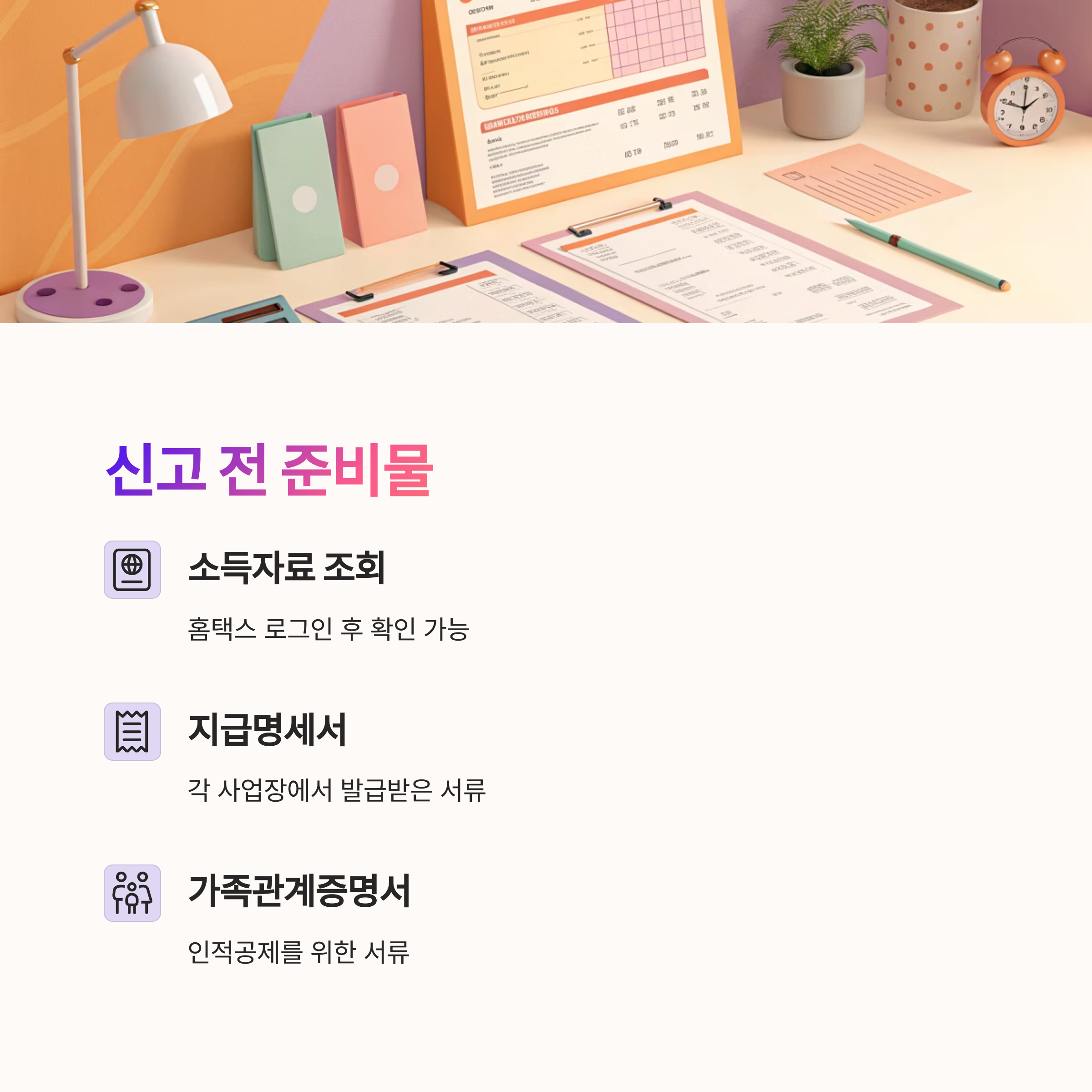 첫째, 누락된 소득이 없도록 모든 근로 내역을 확인하는 것이 중요해요. 홈택스 소득자료 조회에서 안 나오는 수입은 별도로 증빙해야 해요.