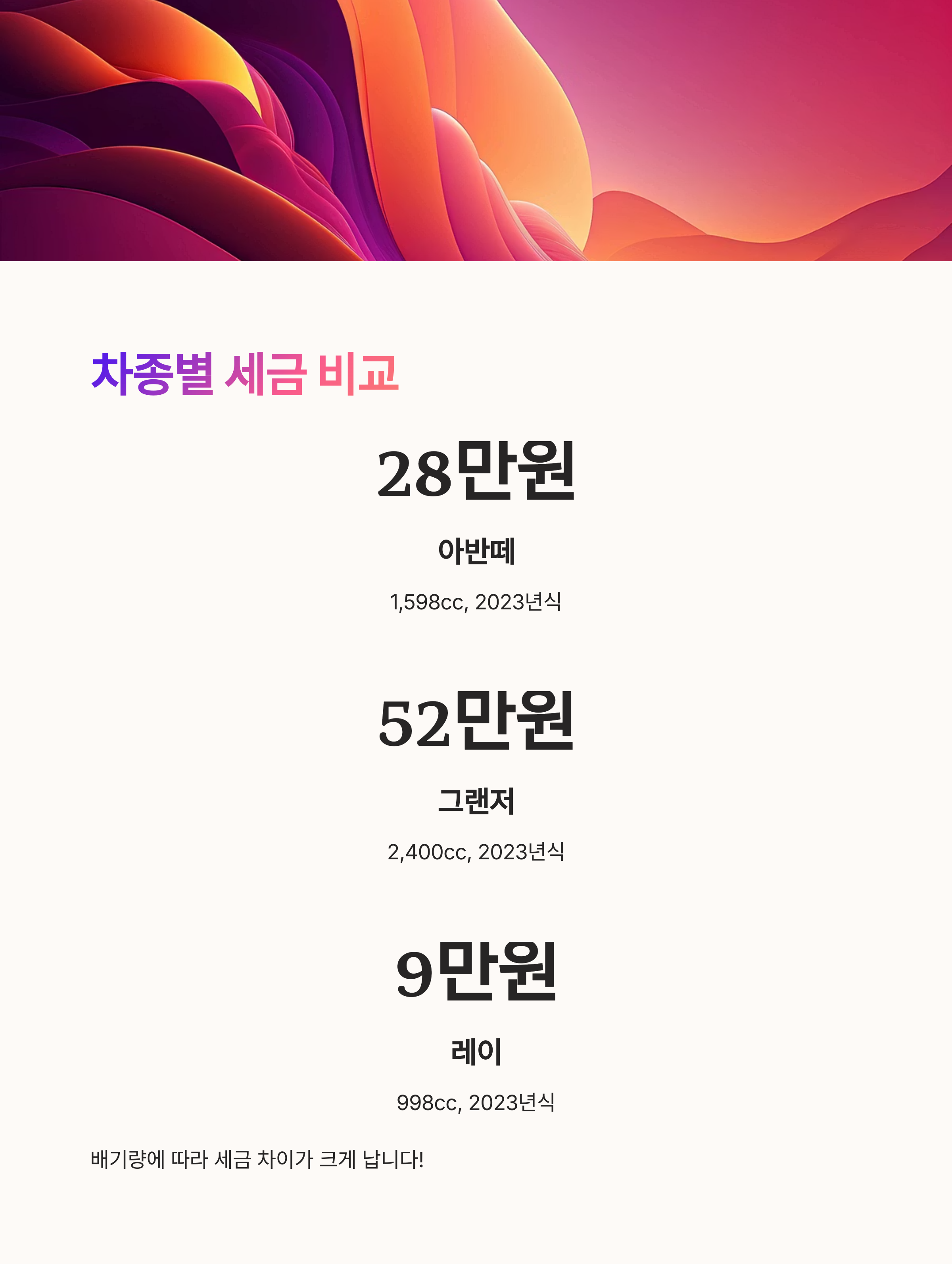 예를 들어 2023년식 아반떼(1,598cc), 그랜저(2,400cc), 쏘렌토(디젤 2,200cc), 레이(998cc) 기준으로 살펴볼게요. 연납 기준으로, 교육세 포함하여 얼마나 차이 나는지 확인해보면 깜짝 놀라실 거예요.
