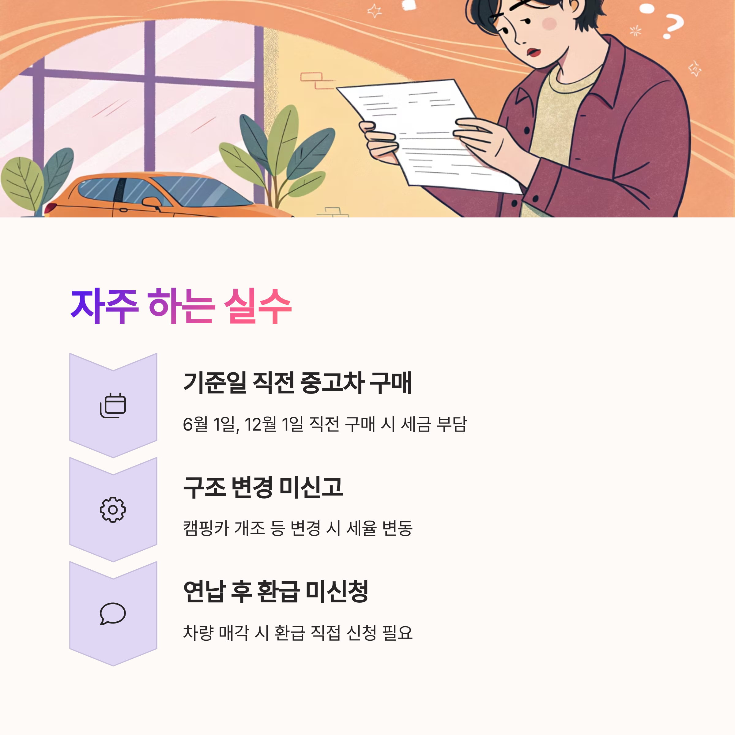 | 중고차 매입 시기 | 기준일 직전 매입으로 세금 부담 | 6월·12월 기준일 피하기 |