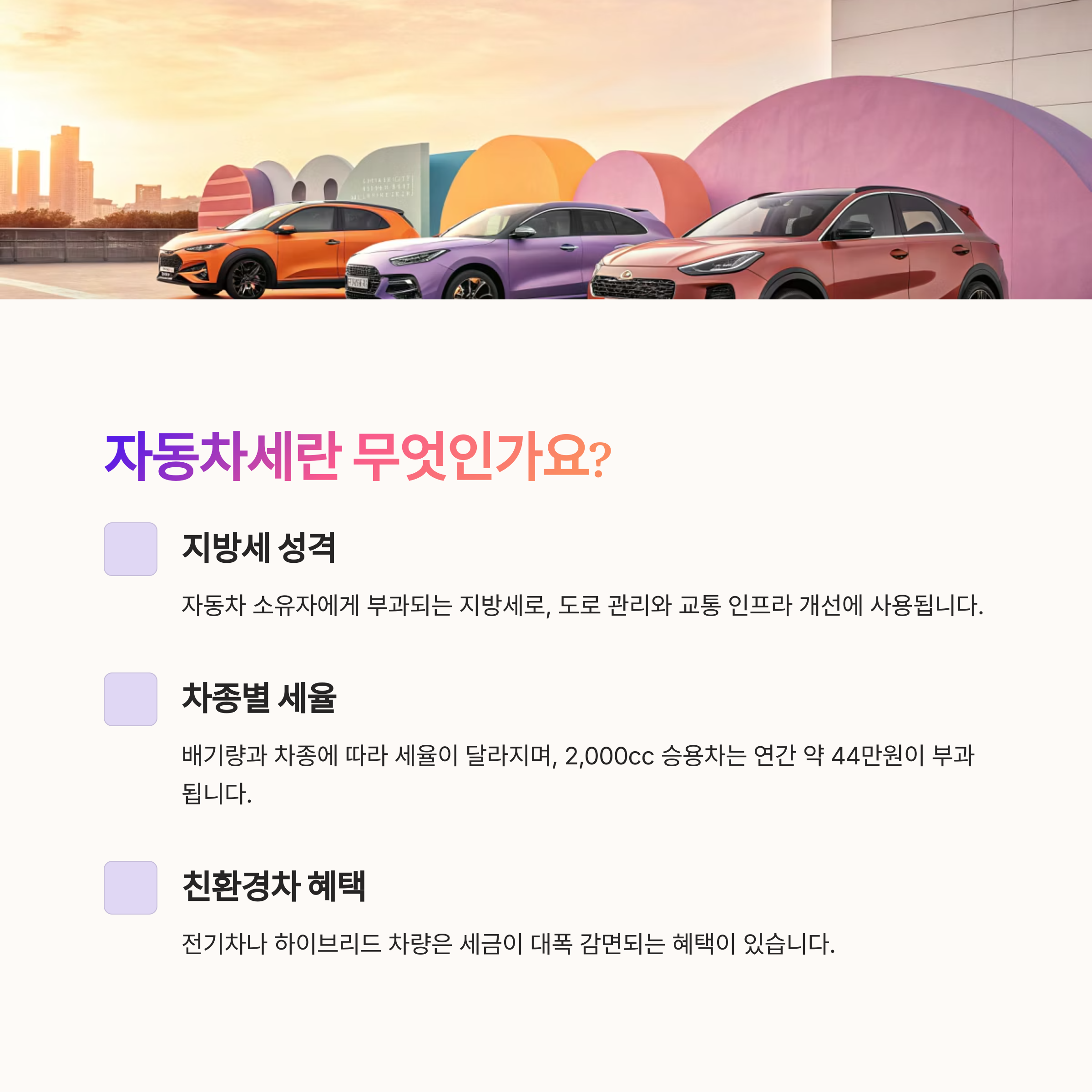 자동차세는 자동차를 소유한 사람에게 부과되는 지방세로, 지방자치단체에서 징수해요. 이 세금은 도로 관리, 교통 인프라 개선, 환경 보호 등의 용도로 사용된답니다. 자동차의 배기량과 차종에 따라 세율이 달라지며, 일반 승용차와 상용차, 친환경차 등으로 분류돼요.