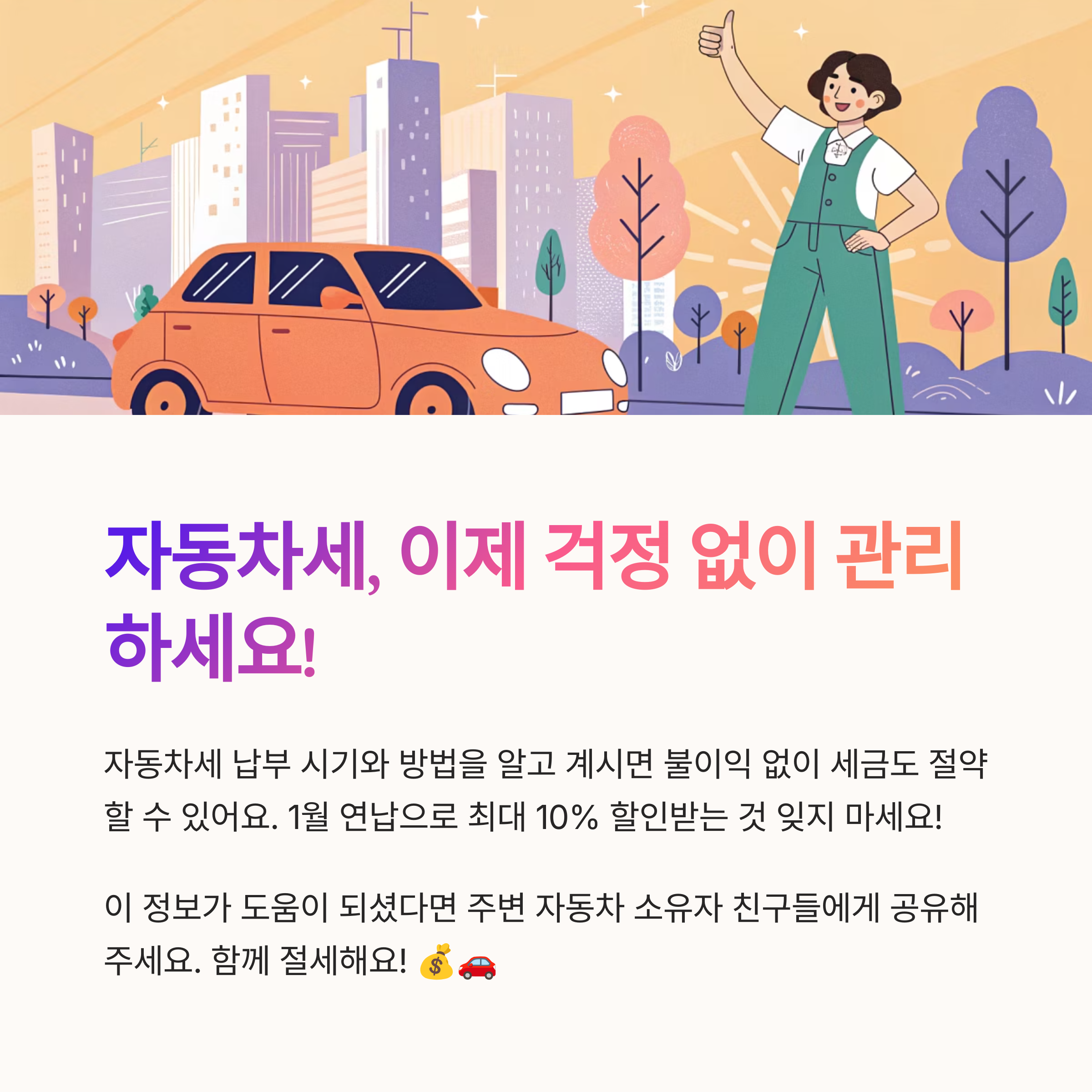 이처럼 연납 신청은 자동차세를 줄일 수 있는 가장 현실적이고 간단한 방법이에요. 차량 유지비를 줄이고 싶다면 꼭 챙겨보세요! 🧾