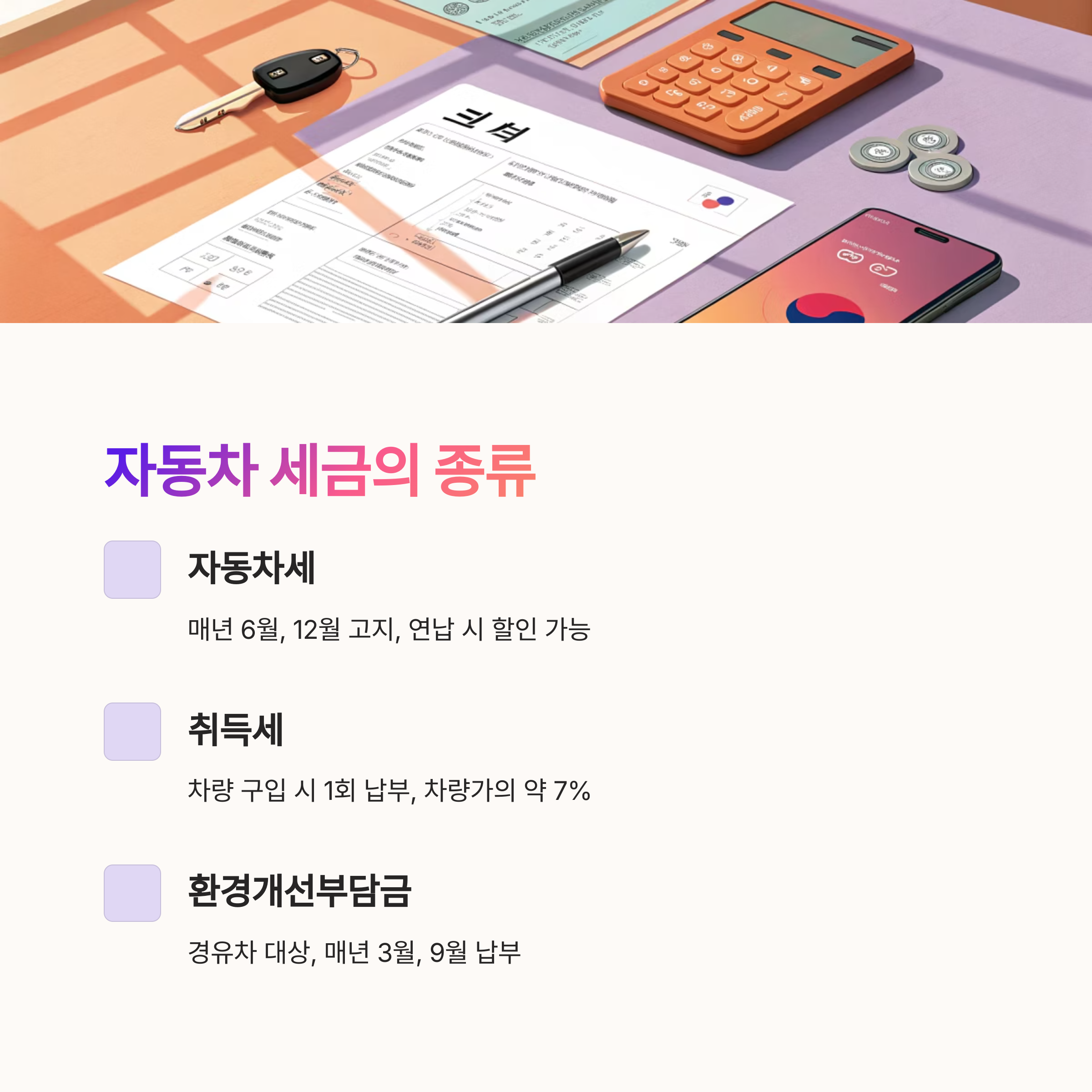 환경개선부담금은 경유 차량이 주요 대상인데, 환경 오염을 유발하는 차량에 대해 별도로 부과돼요. 취득세는 차량을 새로 구입하거나 중고차를 이전 등록할 때 한 번 내는 세금이에요. 금액도 크기 때문에 자동차 구매 시 반드시 고려해야 해요.