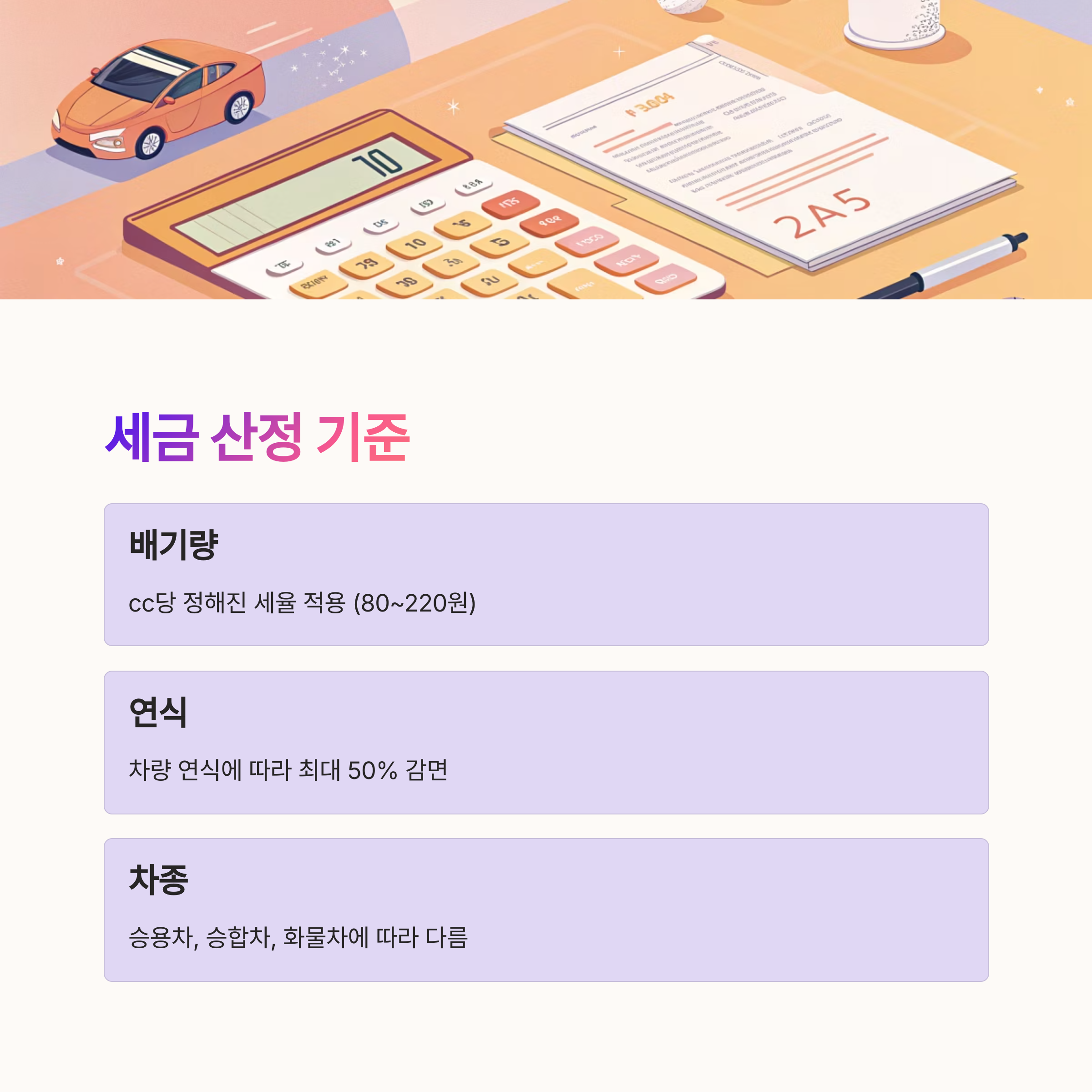 | 승용차 | 배기량(cc당 80~220원) | 최대 50% 감면 | 매년 2회 부과 |