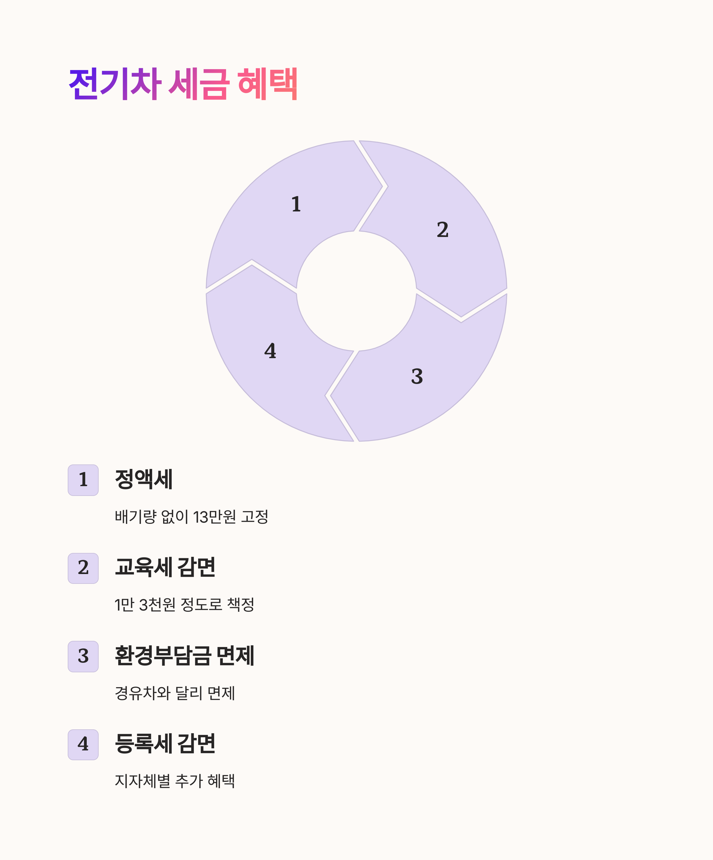 전기차는 기본적으로 ‘친환경차’로 분류돼요. 그래서 자동차세와 교육세가 감면되거나 면제되는 경우가 많아요. 예를 들어 테슬라 모델3나 아이오닉5 같은 차량은 일반 승용차 대비 자동차세가 50% 이상 줄어드는 경우가 많아요.