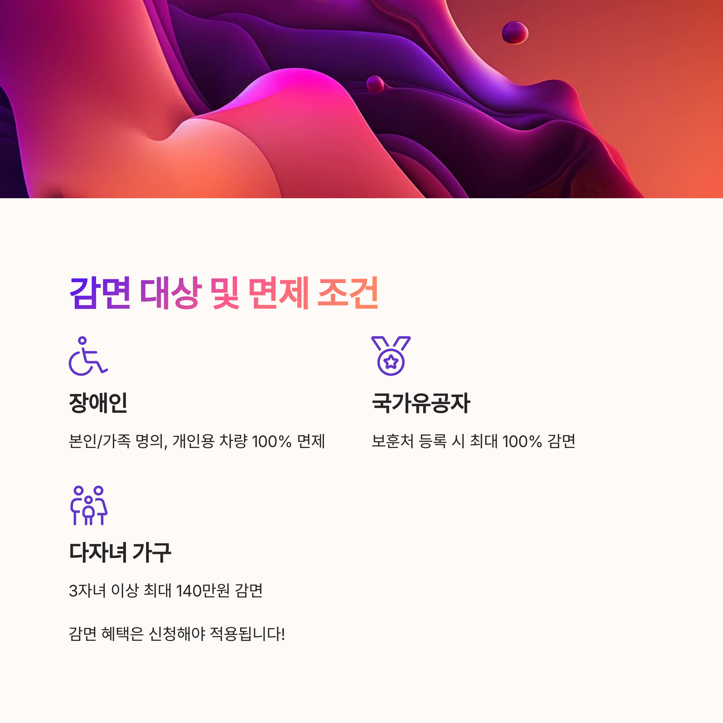 가장 대표적인 감면 대상은 장애인 차량이에요. 본인 또는 직계 가족 명의로 차량을 등록하면 취득세 전액 면제가 가능해요. 단, 차량 용도가 반드시 본인의 이동 목적으로 사용돼야 하며, 일정 기간 내 매도하면 혜택이 취소될 수 있어요.
