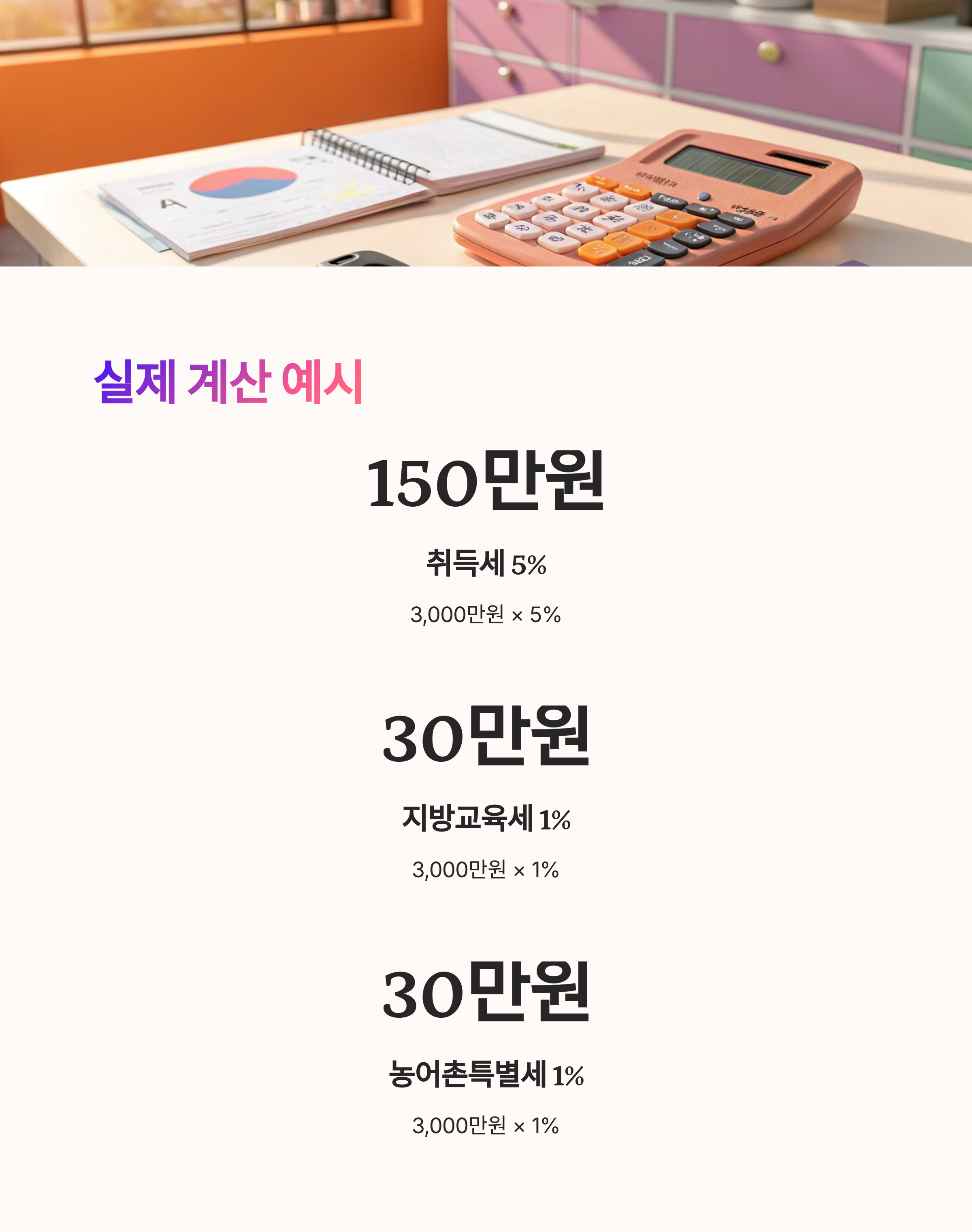 ① 취득세 5%: 3,000만 원 × 5% = 150만 원