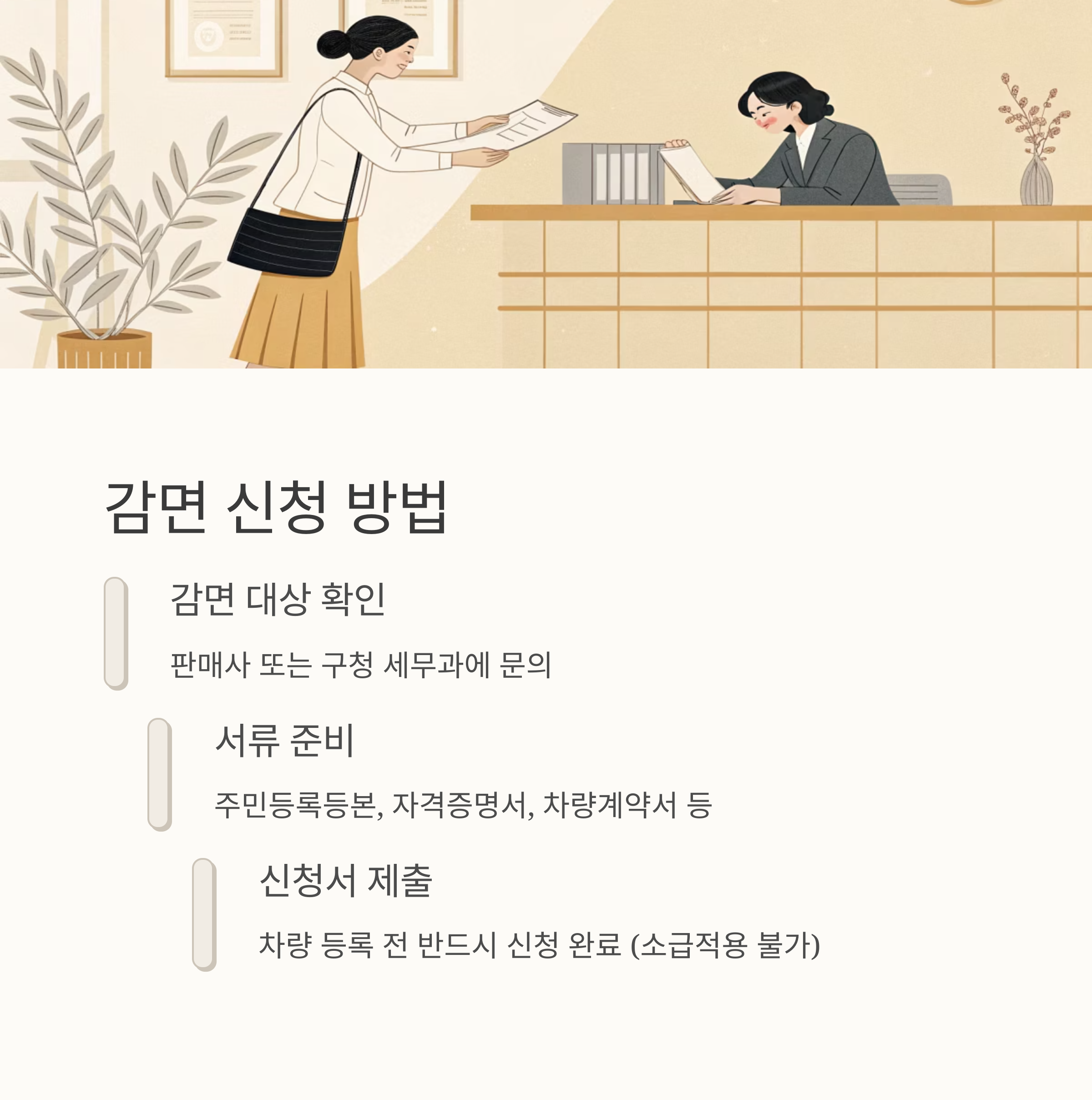 이후 차량 등록 시점에 등록사업소나 자동차민원 종합사이트(이파인) 등을 통해 감면 신청서를 제출하고, 관련 증빙 서류를 함께 제출해야 해요. 일반적으로 주민등록등본, 자격 증빙서류, 차량 매매계약서 등이 필요해요.