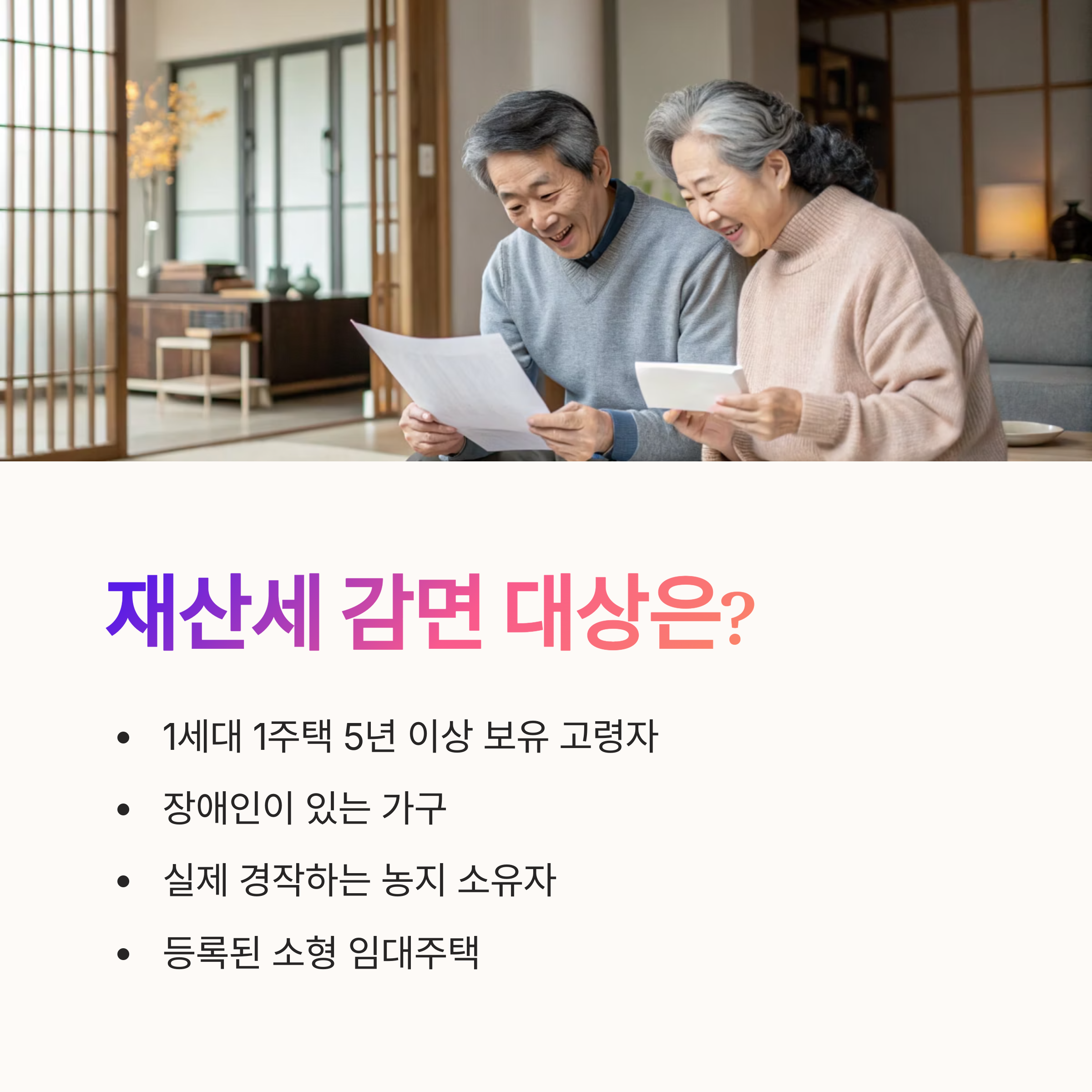 또한 1세대 1주택자는 다양한 세제 혜택을 받을 수 있어요. 장기보유나 고령자 공제도 받을 수 있고, 일정 금액 이하의 공시가격이면 재산세가 감면되기도 해요. 예를 들어 공시가격 1억 원 이하의 주택은 일정 수준 이하 세금만 내거나, 아예 면세될 수 있답니다.