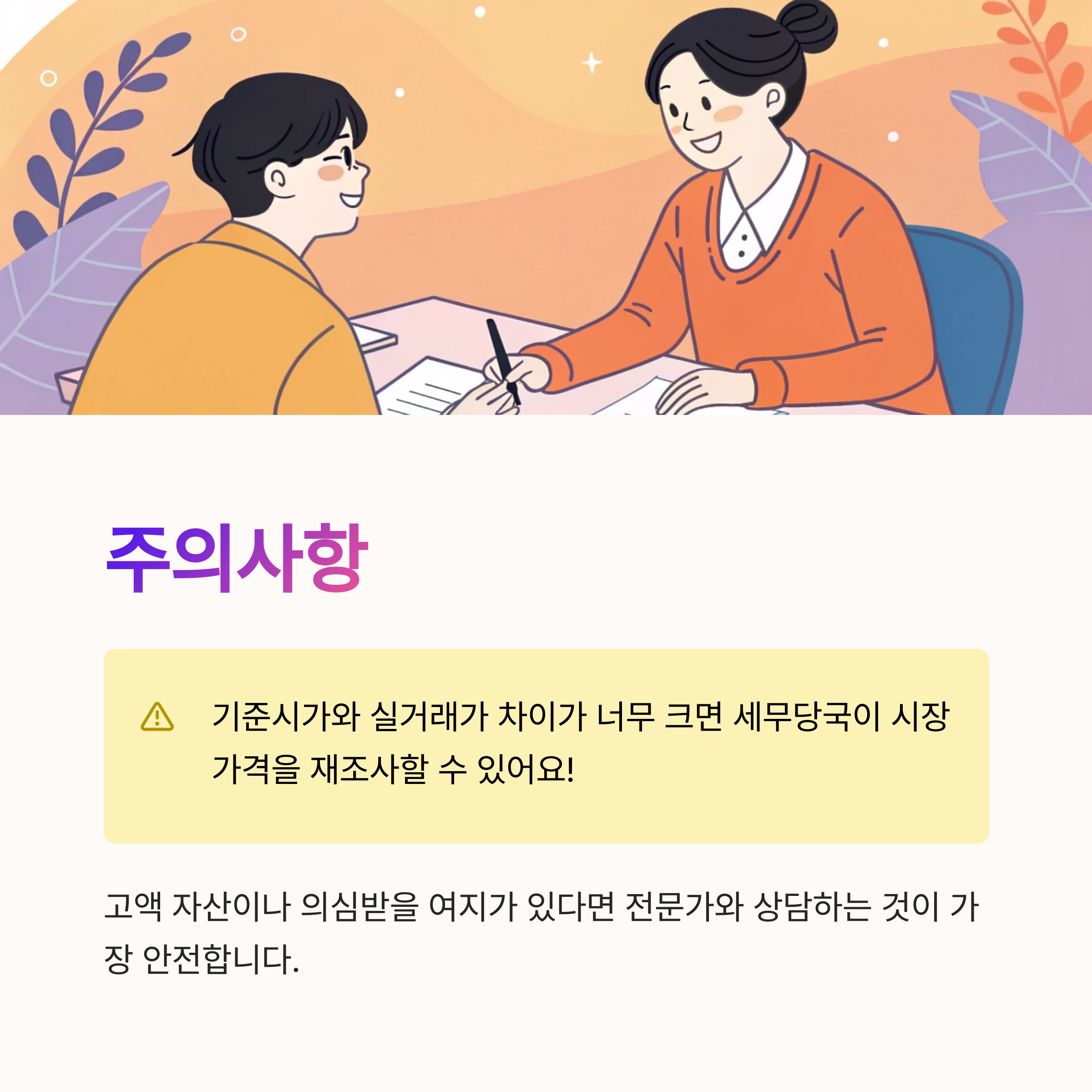 기준시가는 세무 기준의 '최소 인정 가치'로 사용되기 때문에, 시가보다 낮아도 상관없지만 너무 큰 차이가 나면 국세청에서 문제 삼을 수 있다는 사실, 꼭 기억해 주세요!