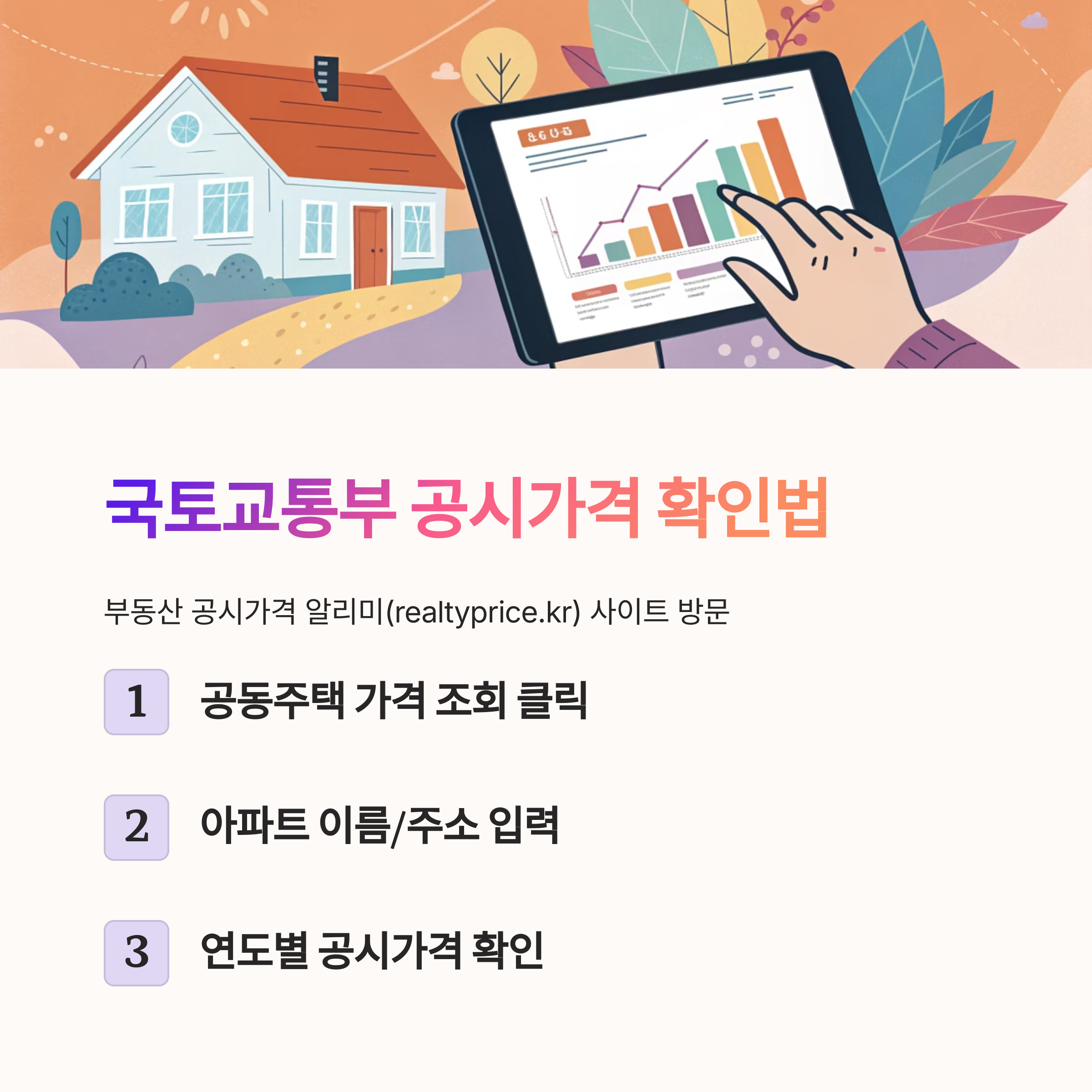‘부동산 공시가격 알리미(www.realtyprice.kr)’ 사이트에 접속하면 아주 쉽게 확인할 수 있어요. 사이트에 들어가면 ‘공동주택 가격 조회’라는 메뉴가 있고, 여기에 아파트 이름이나 주소를 입력하면 해당 단지의 공시가격이 연도별로 쭉 나와요.